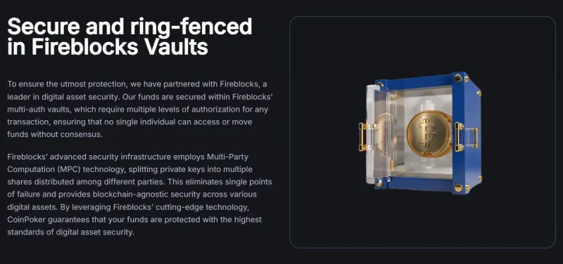 Pour une sécurité accrue, CoinPoker utilise également des vaults Fireblocks et un logiciel de générateur de nombres aléatoires (RNG) décentralisé que les joueurs peuvent vérifier la randomité après chaque main, en utilisant l'algorithme Keccak-256 d'Ethereum.