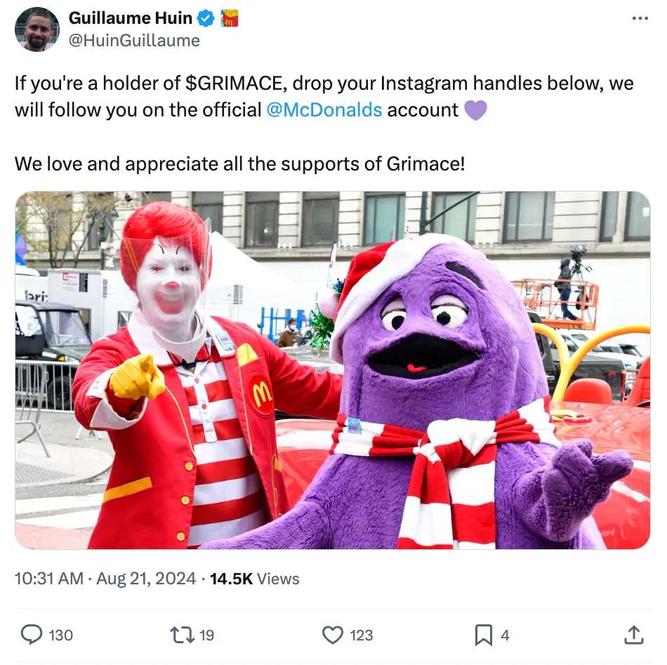 Late Wednesday morning, posts on both McDonald’s Instagram page—which boasts some 5 million followers—and the personal Twitter account of Senior Marketing Director Guillaume Huin began extolling a new GRIMACE token. The Solana meme coin was started on popular launcher Pump.fun—perhaps an unusual choice for a $207 billion company.