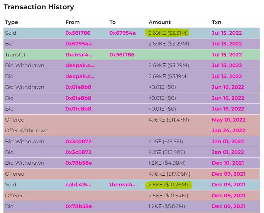 Prior to today’s sale, Punk #4156 was purchased back in December 2021 for 2,500 ETH. That's 191 ETH less than today, but worth $10.26 million in December, since ETH was trading for more than three times today’s price. That means today’s seller earned a relatively small profit in Ethereum but suffered heavy losses in terms of USD value.