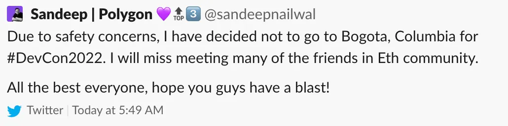 Twitter buzzed early Monday with rumors of Devcon attendees being robbed and experiencing other safety issues after arriving in Bogotá. On Monday morning, Polygon co-founder Sandeep Nailwal tweeted that he would no longer be attending Devcon “due to safety concerns.”