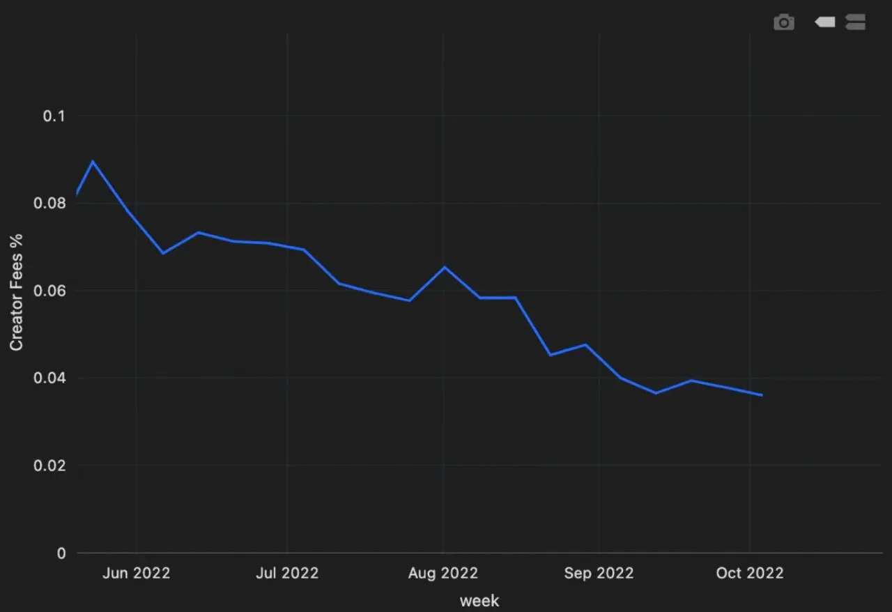 Huang also shared data from Magic Eden that indicates creator royalties on Solana have been trending downward for months. The graph, seen above, shows the amount of royalties that the top 50 Solana NFT creators receive as a percentage of secondary market trading volume, and it ticks down from about 9% in May to less than 4% now.