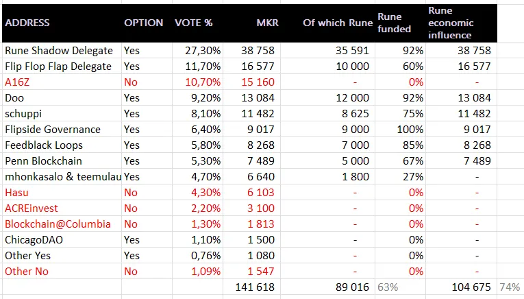 This data, for instance, suggests that of Flipside’s total 9,017 MKR holdings, 9,000 of those tokens had been delegated by Christensen. Conversely, mega fund a16z holds zero Christensen-delegated funds and voted against the proposal.
