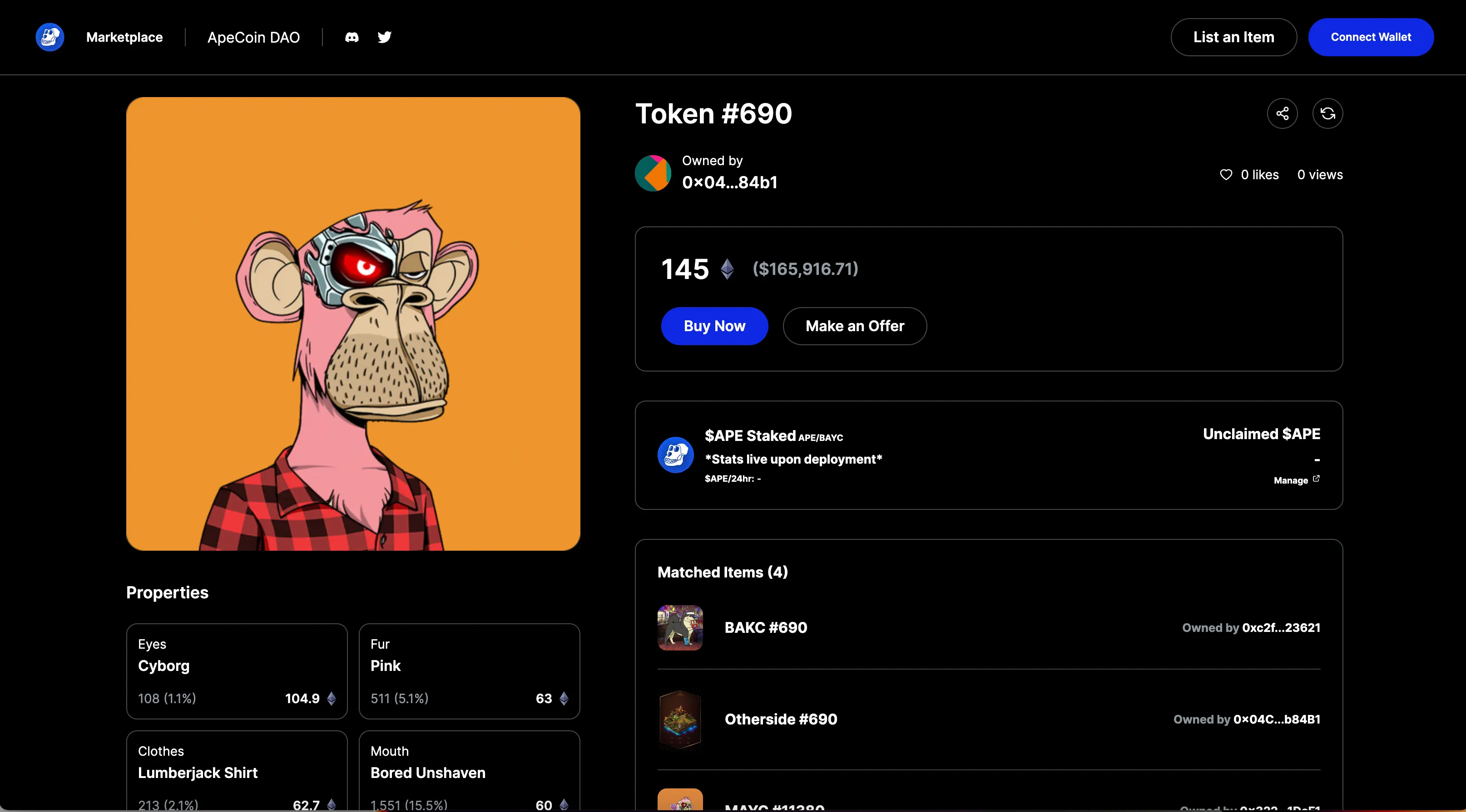 The other potential benefits come with deeper Bored Ape ecosystem integration than typical NFT marketplaces. The ApeCoin marketplace will show ApeCoin staking details for any listed NFT, for example, as well as highlight the matching-numbered NFTs across Yuga’s projects. It’ll also tell shoppers whether a Bored Ape has used a Serum NFT to yield a Mutant Ape NFT.