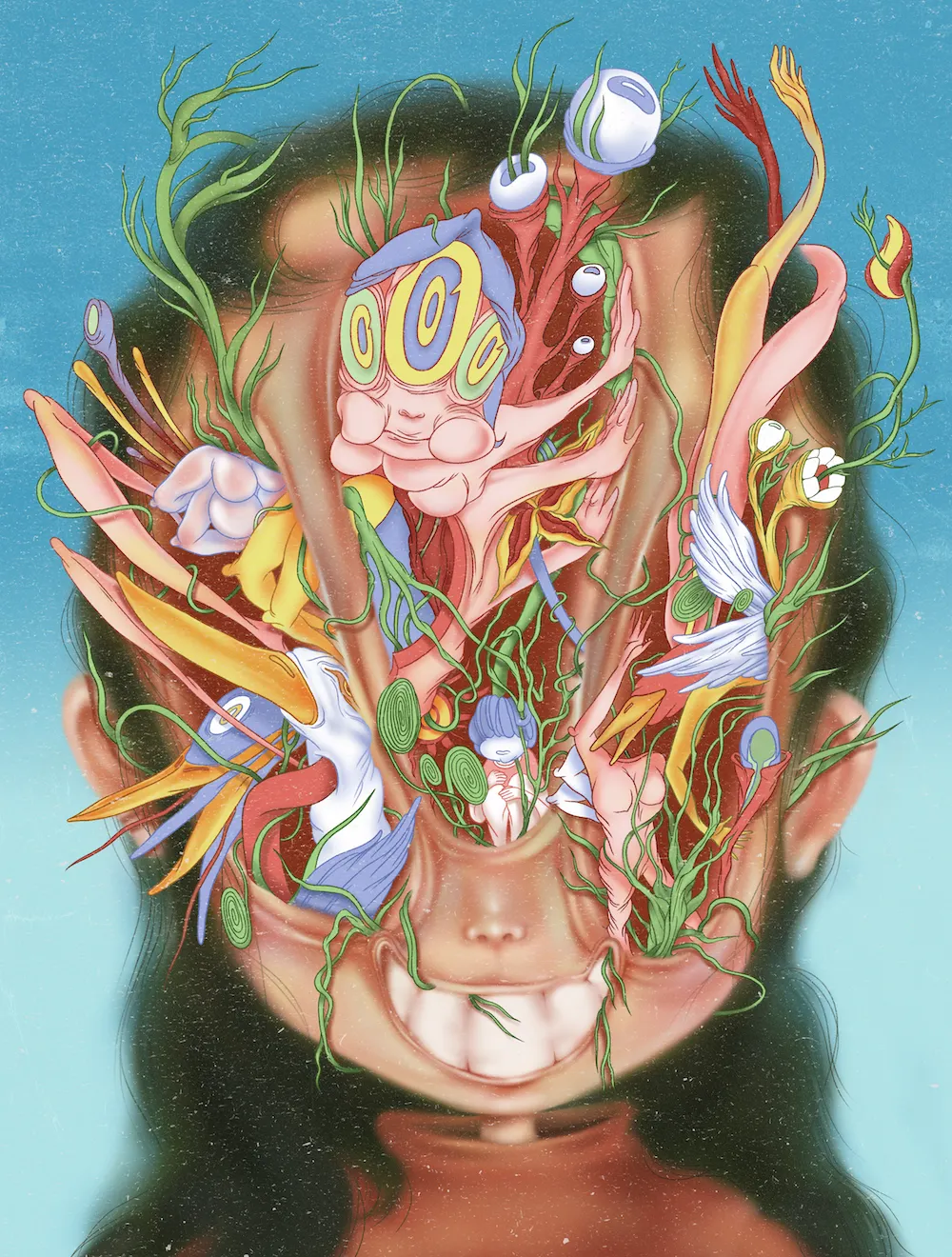 Her latest compositions similarly showcase a woman with oversized eyes, in some cases with vibrant flowers and creatures bursting through the sockets. They’re dreamy and surreal works, but tinged with the shock of body horror. Seneca told Decrypt that the pieces represent her continued evolution as an artist and an individual.