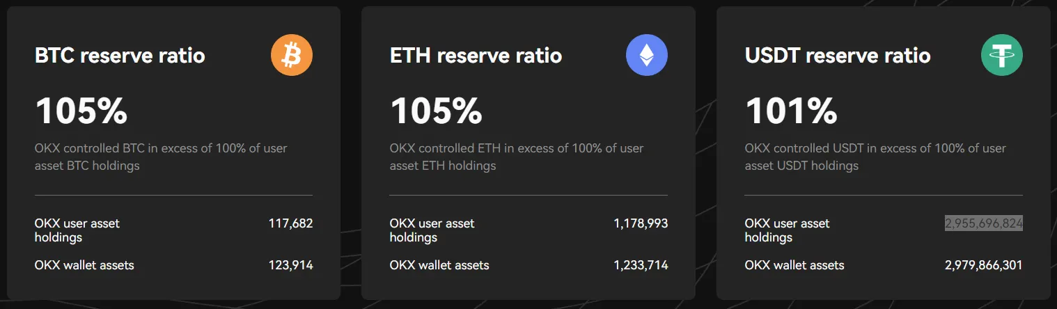 New features in today’s report include a detailed breakdown of the assets, showing OKX is overcollateralized with a reserve ratio of 105% for BTC, 105% for ETH, and 101% for USDT.