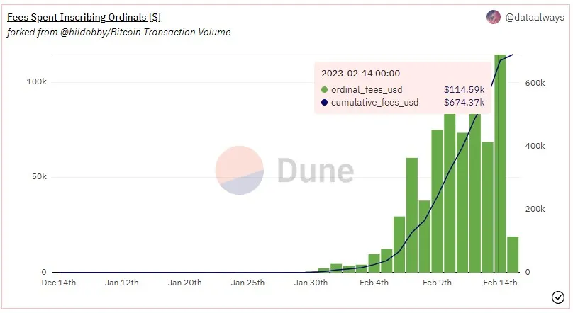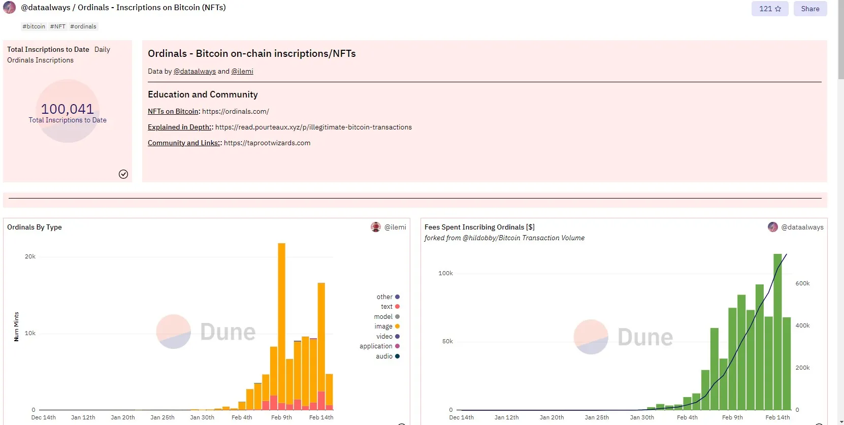 The 100K milestone was closely watched, and comes less than a day after Ordinals crossed the 75,000 inscription mark, according to a Dune report, with transaction fees for the digital collectibles topping $114,590 earlier today.
