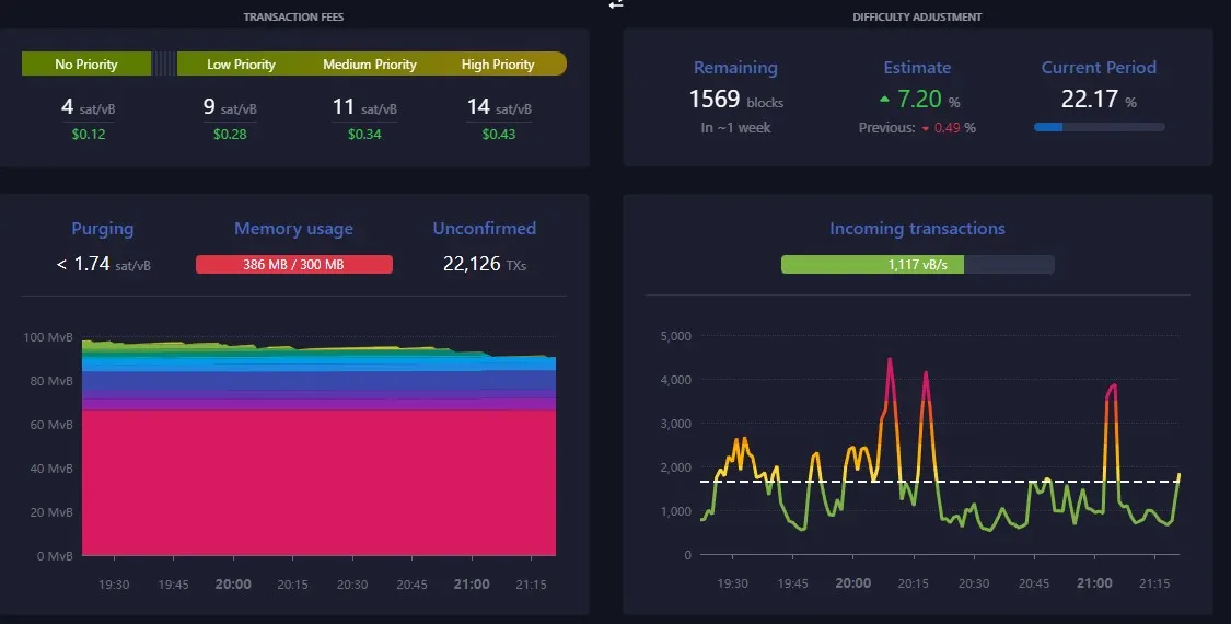 As Ordinals surged toward the six-figure mark, the memory usage per block exceeded the standard 300 MB capacity by 86 MB, causing the network to purge any transaction less than 1.74 sats/vB, or Satoshi per byte, according to data from Bitcoin explorer, Mempool.
