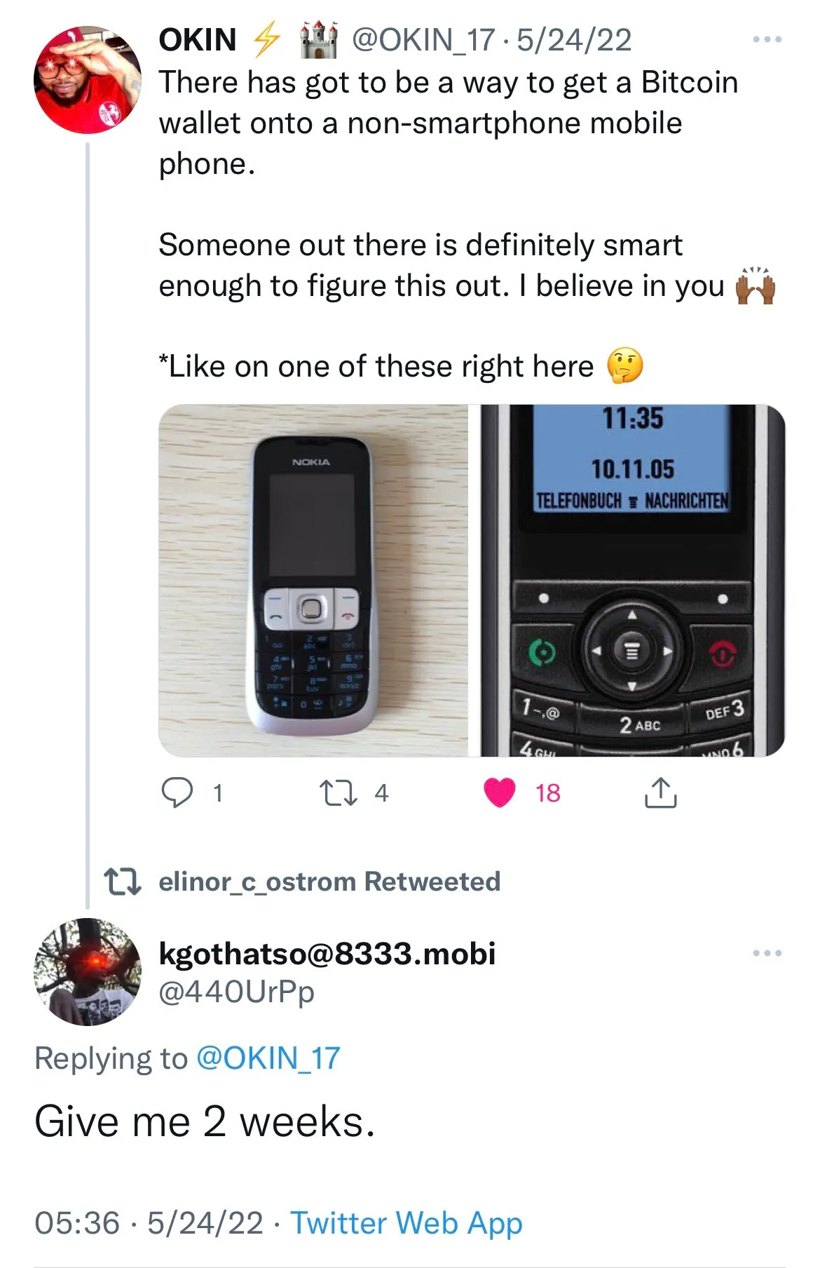 “I had set up a raspberry pi running both a Bitcoin and Lightning node and was trying to figure out what I could build on top of it,” Ngako told Decrypt via direct message. “A USSD project was intriguing because quite a lot of African Bitcoiners were already talking about building a wallet for feature phone users.”