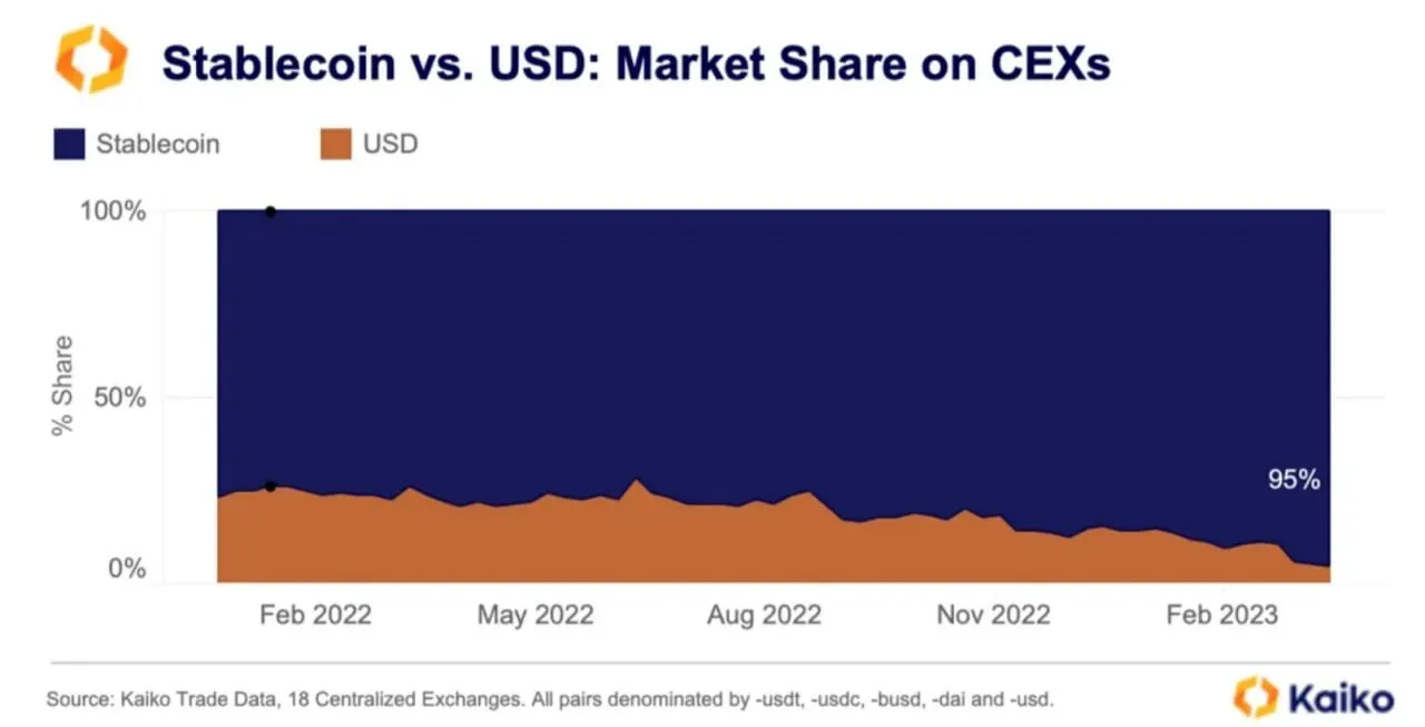 The market share of fiat dollars and stablecoins has also drastically shifted, with stablecoin volumes on centralized exchanges rising from a 77% share of volumes to 95% in just over a year.