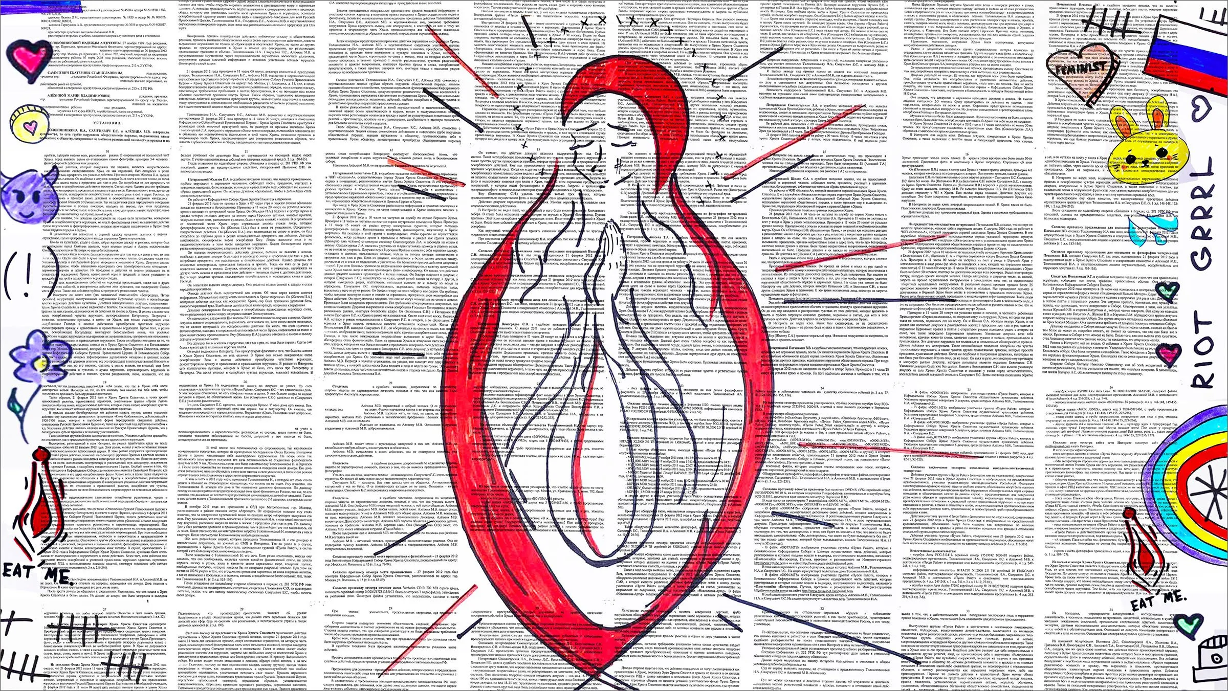 The NFT in the latest case, titled "Virgin Mary, Please Become a Feminist," depicts the Christian icon framed in what the criminal citation describes as "anatomical details of the female external genitalia," according to a translation provided by Pussy Riot. The drawing is superimposed over a scan of Tolokonnikova's arrest papers from the 2012 incident. Pitchfork reported that it reviewed translated court documents that mention the NFT in question.