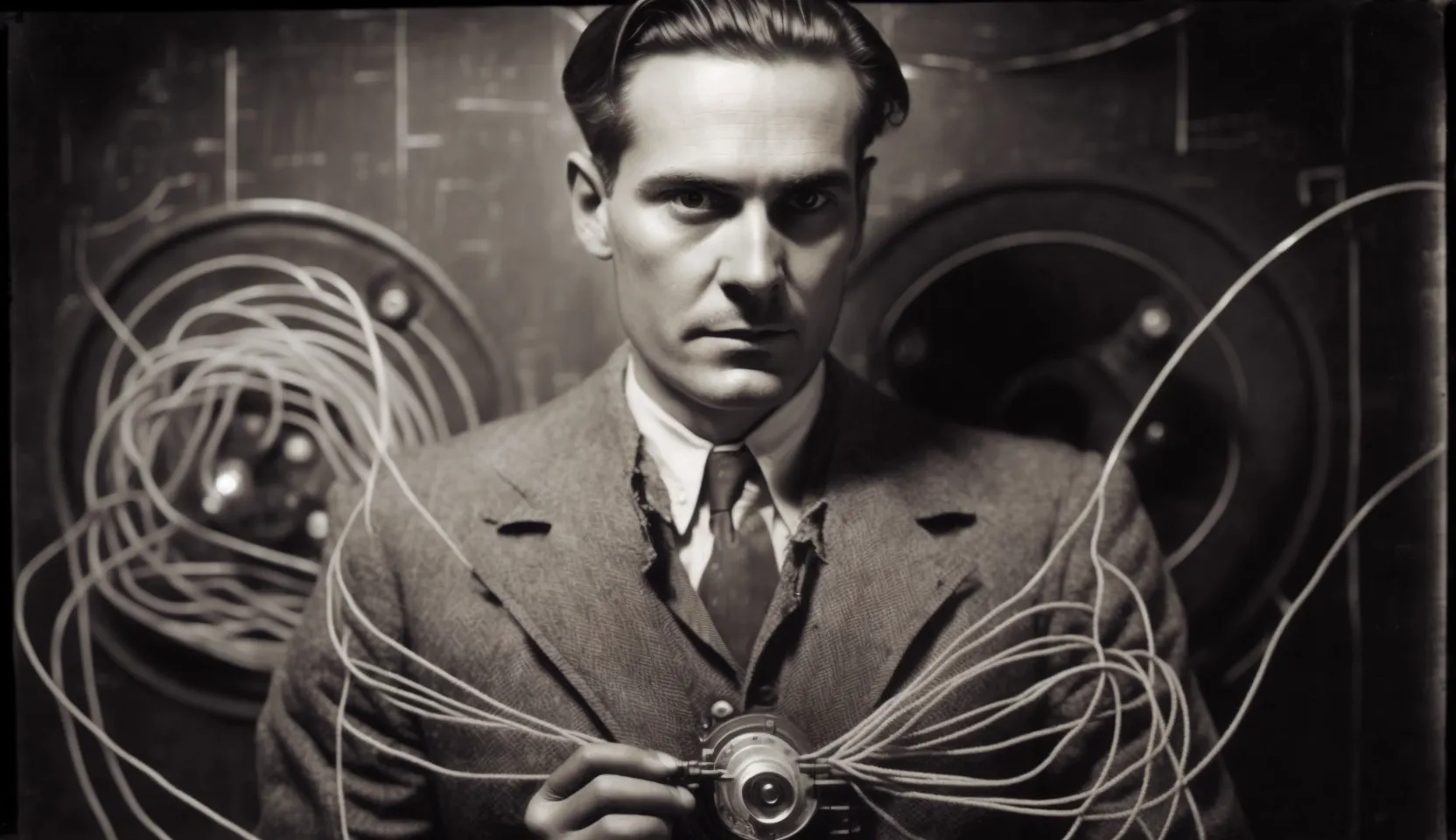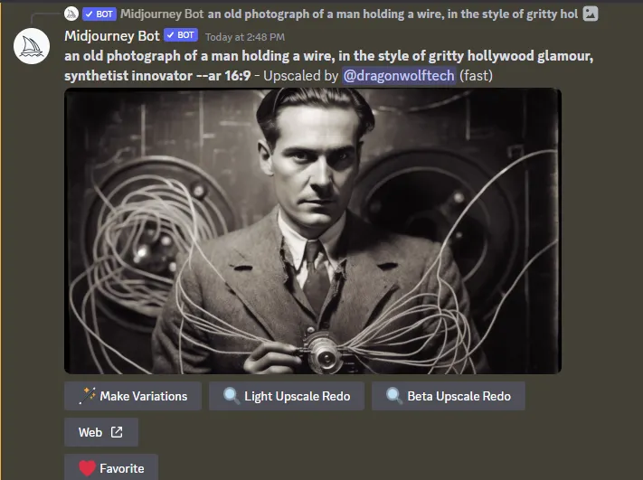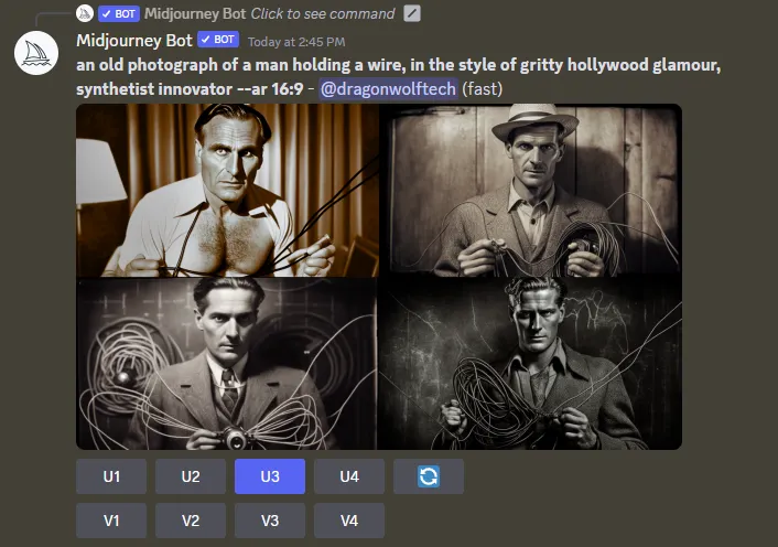 After the image was uploaded to Midjourney, the AI gave four options to generate the next picture. For this example, we chose "an old photograph of a man holding a wire, in the style of gritty Hollywood glamour, synthetist innovator --ar 16:9."