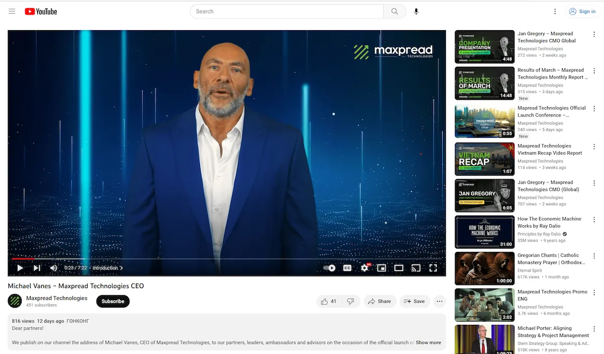 In a YouTube video posted to its official Maxpread account on April 8, a claimed CEO named “Michael Vanes” gives an address about the company’s launch. But the agency claims that it’s not a real person; Maxpread’s real CEO is actually Jan Gregory, who the company had called its chief marketing officer and corporate brand manager.
