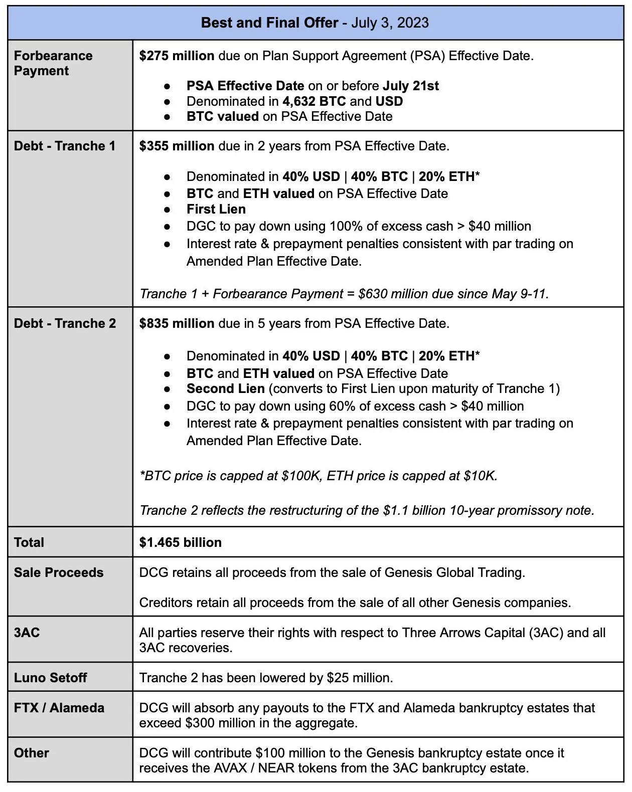 The document outlines a proposed plan that involves $1.465 billion in payments and loans, with the deadline for accepting the offer set for 4 pm ET on July 6. The failure to agree to the plan would result in Gemini filing a lawsuit against DCG and Silbert personally.