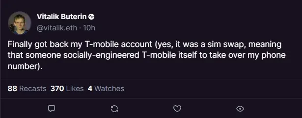 “It was a SIM swap, meaning that someone socially-engineered T-Mobile itself to take over my phone number,” said Buterin.