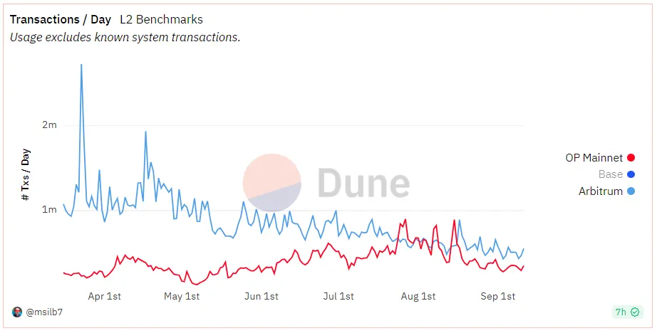 Optimism’s transactions briefly outpaced Arbitrium during the hype around the launch of global ID project Worldcoin, which is built atop Optimism's infrastructure. However, they slipped back below Arbitrum's transactions as the hype around Worldcoin faded.