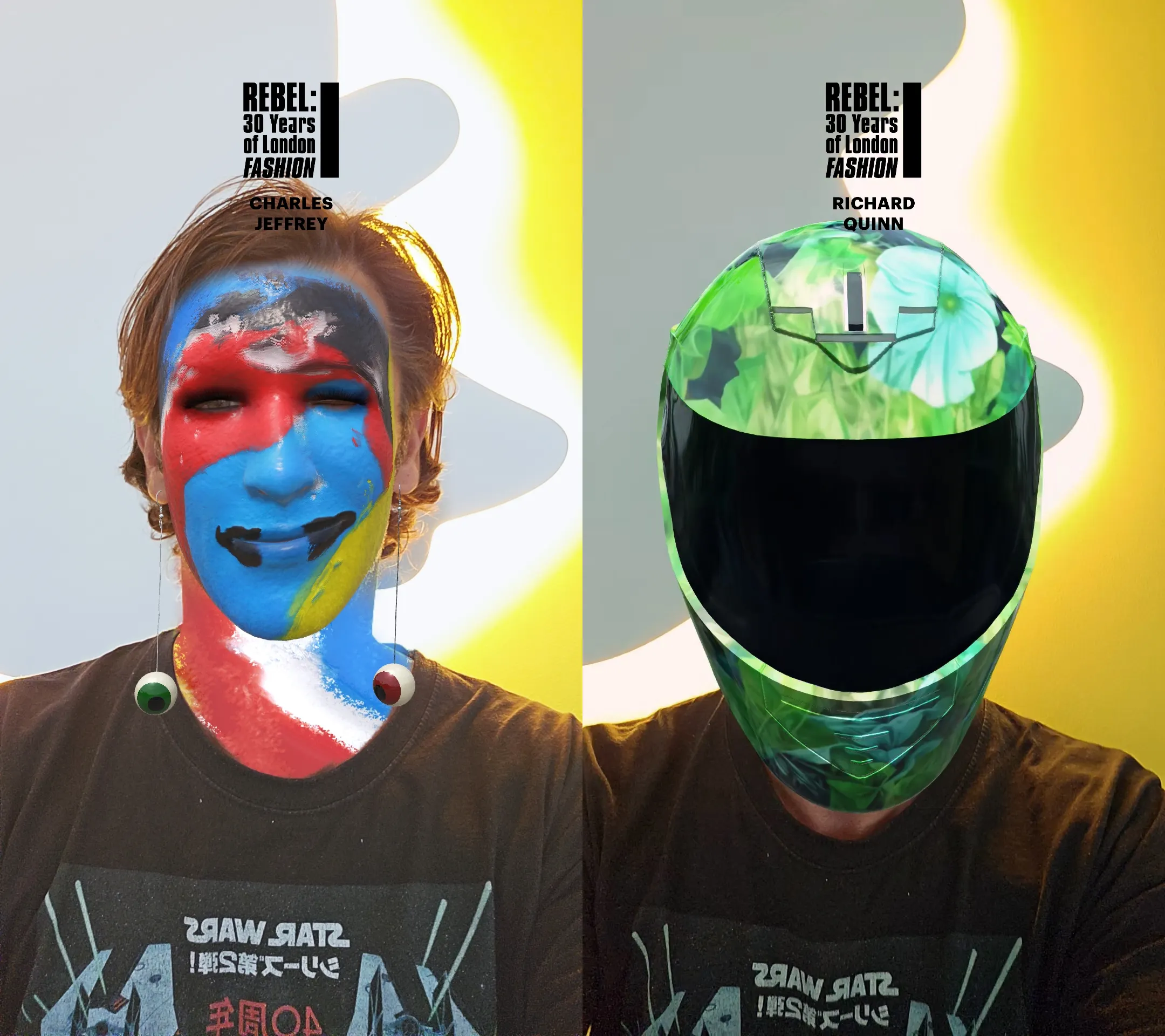 Each lens replicates one of nine hair and makeup looks from their respective designers. These include the extreme face paint showcased by Charles Jeffrey Loverboy for spring 2018, the Klein blue hair and makeup that newcomer Chet Lo sent out for spring 2023, and the Richard Quinn floral motorcycle helmet that walked his fall 2018 runway—which was attended by the late Queen Elizabeth II.