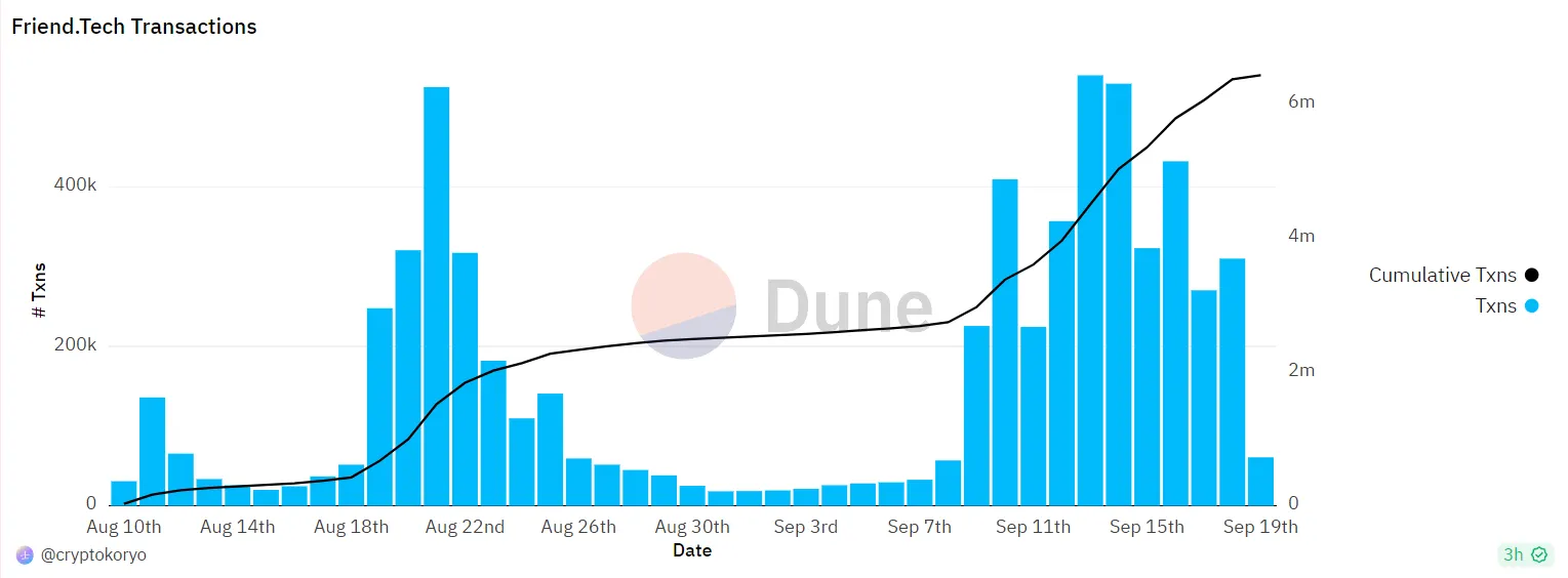 The number of Friend.tech Keys purchased and sold has increased since September 9, reaching a new peak of 539,810 transactions on September 13, according to data from Dune dashboard analyst CryptoKoryo.