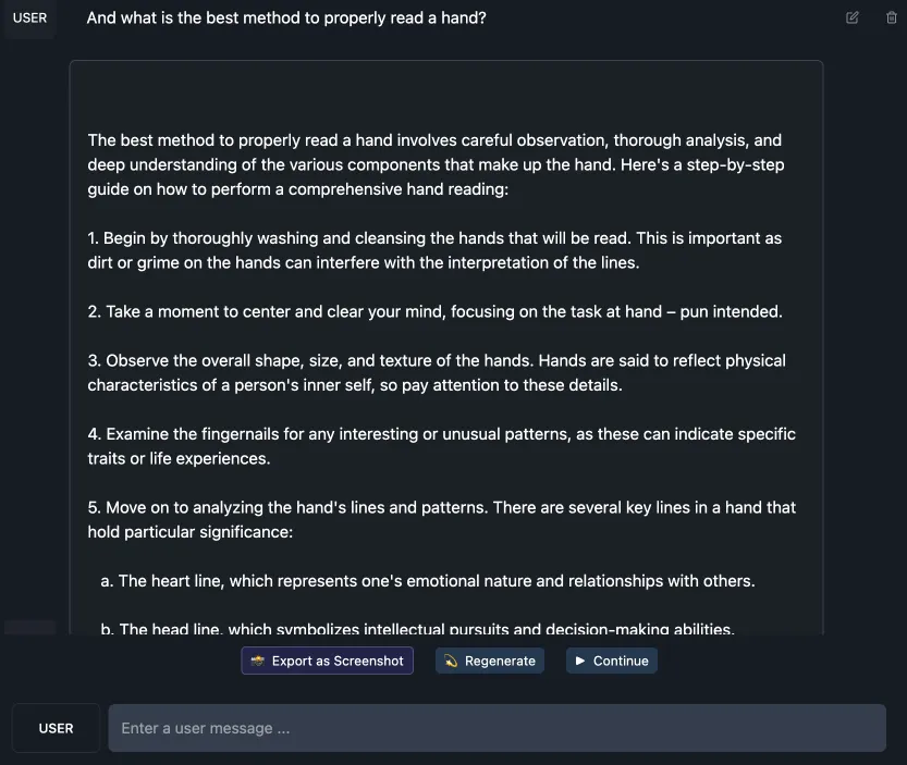 Pit it against GPT-4, and Trismegistus shows its cheeky side. Ask about hand readings, and it dishes out a full guide. After telling us to wash our hands and clear our minds, it provided a brief blueprint on what to look for as palm readers.