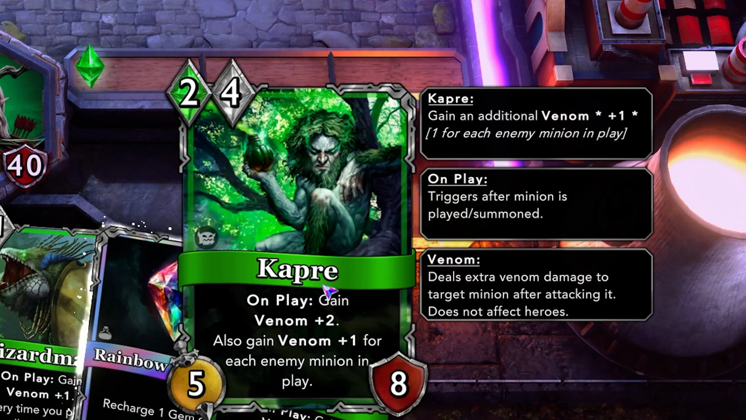 Outside of the default packs, there are a lot of fun cards that you could create a custom deck around. For example, you can embark on a strategy that requires you to play a "champion" card from each of the seven colors before playing the Rainbow Champion, which will destroy the enemy hero—resulting in an immediate win.