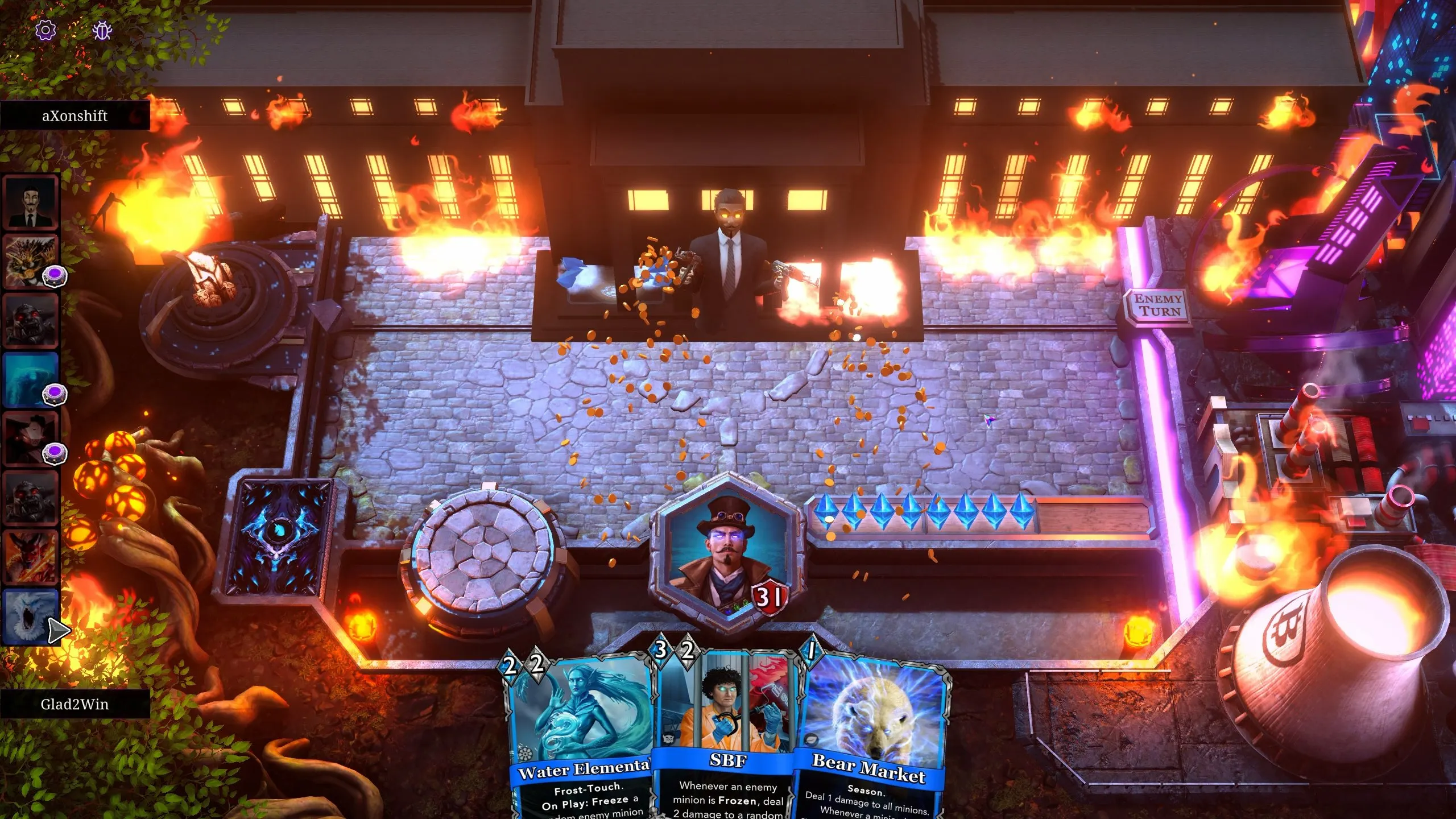For example, dominating with the default Blue Alchemist deck is all about getting SBF or a Yeti on the board and triggering/buffing them with the freeze mechanic. Meanwhile the Purple Occultist deck is focused on playing Zuckazoid and buffing him by banishing enemy minions.