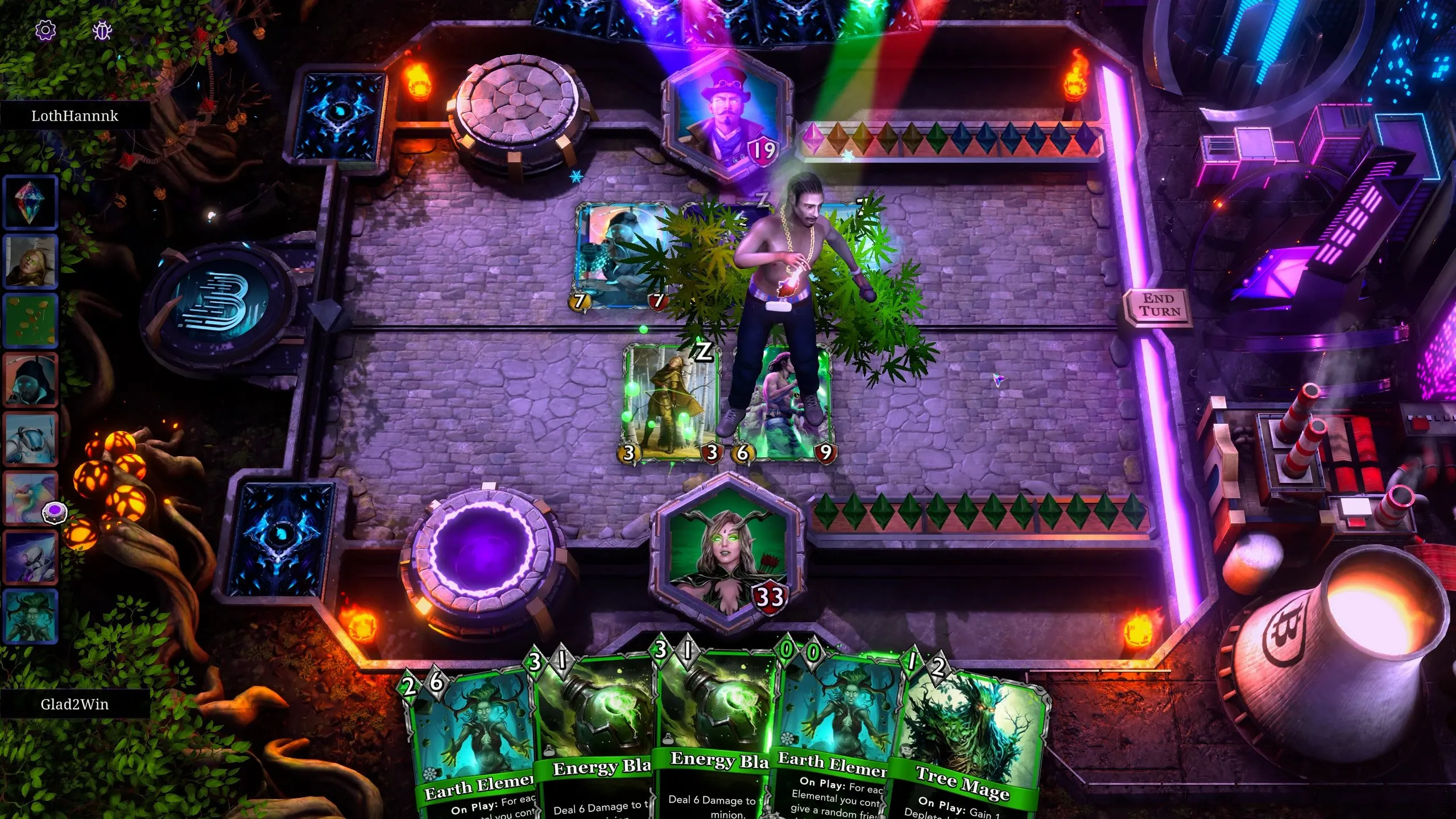 Whatever you think of the memes, the card animations confirm how polished and thoughtfully made this game is. The “Blaze Dog” card, for example, spawns in a Snoop Dogg-like character who blows green smoke over your cards to buff them. And an anonymous figure with akimbo AK-47s appears when you play the Satoshi Nakamoto card. Again, they may be cheesy—but they look good and make the game feel like it’s jumping out of the screen.