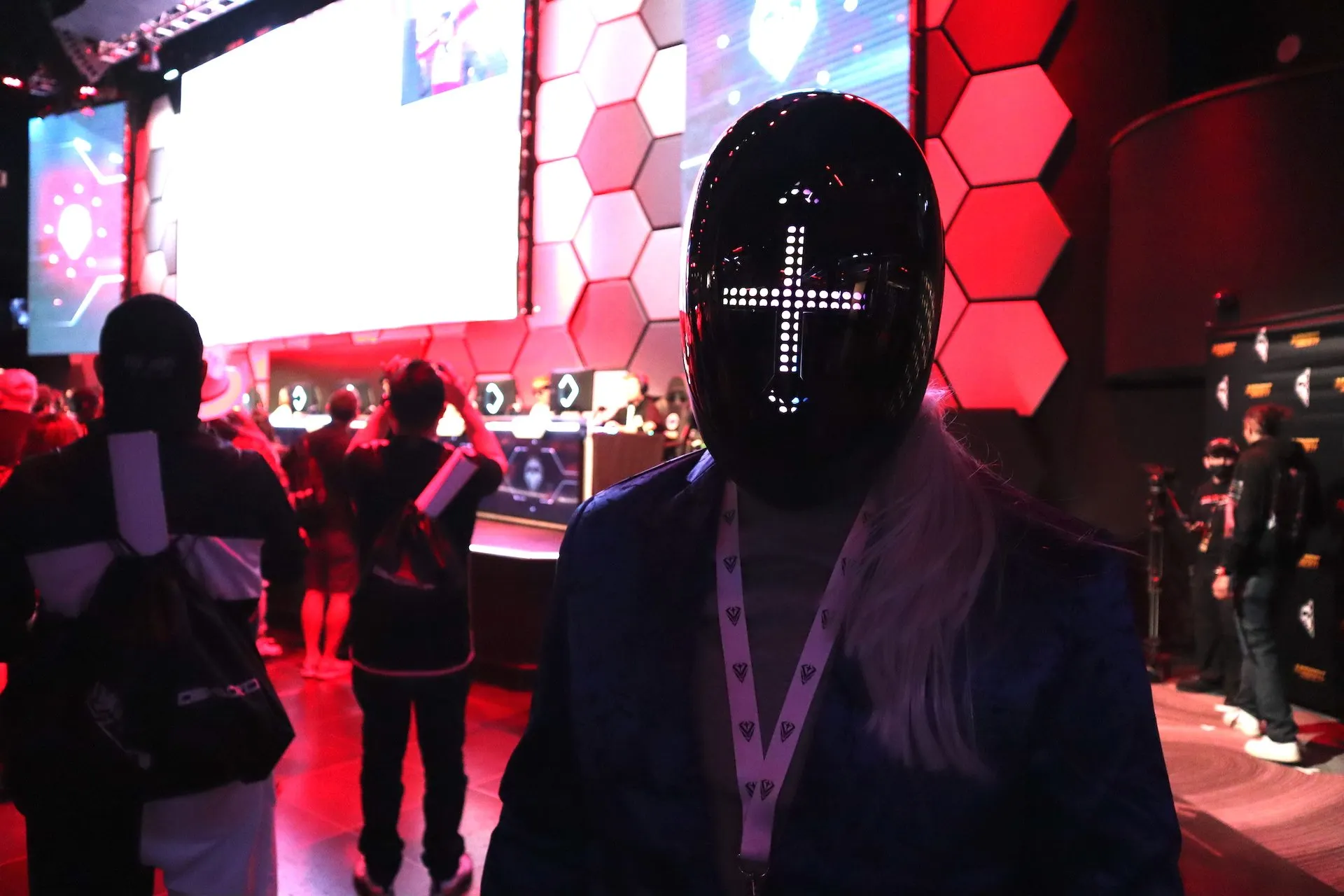 Another attendee dressed up as the avatar from his Midnight Society Founders NFT, with a custom-built light-up helmet, blazer, and synthetic wig ponytail, telling Decrypt that he paid someone to build the helmet to exactly match his avatar.