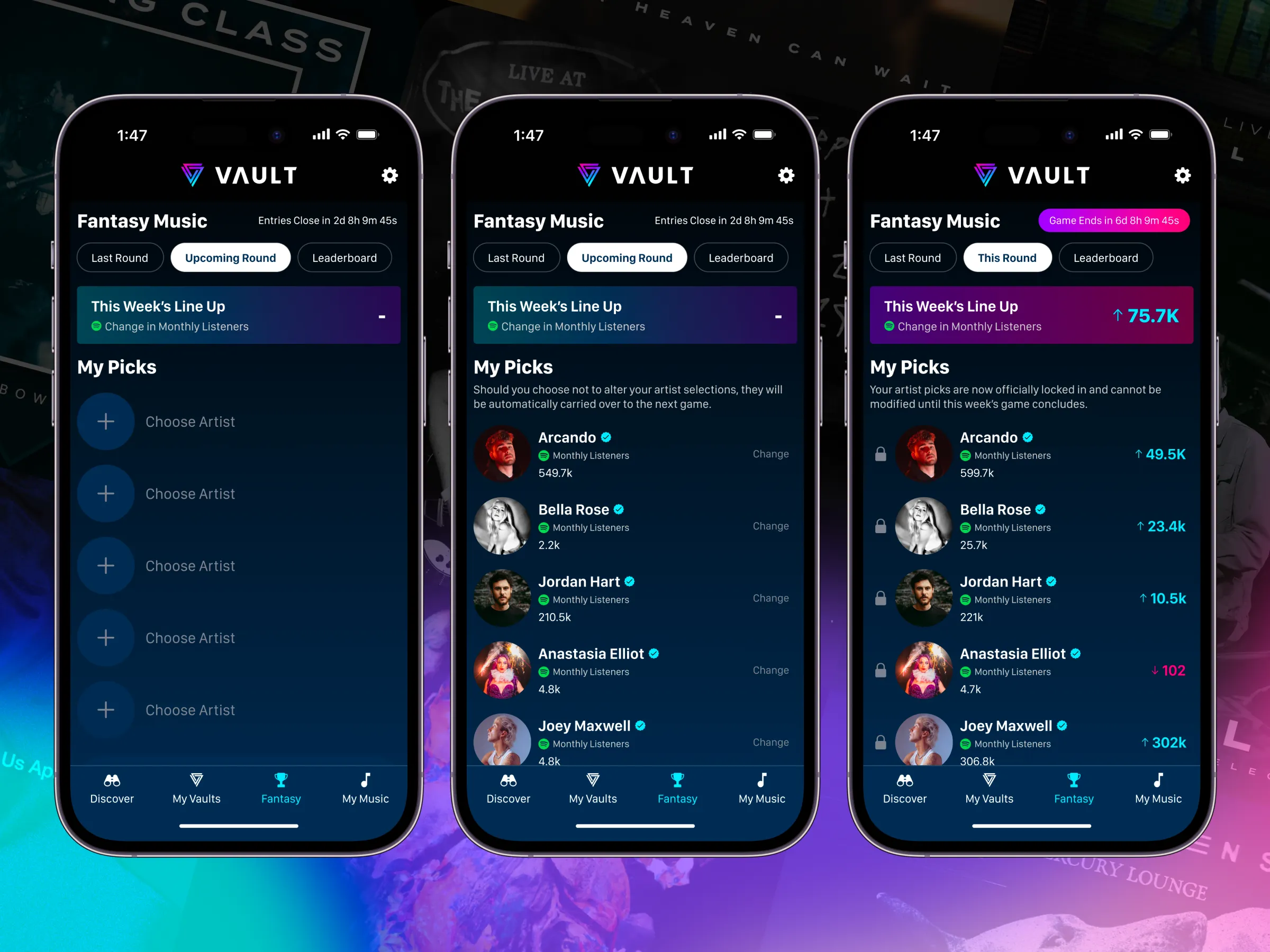 Currently in a private alpha, Vault’s Fantasy Music game tasks players with building a roster of five artists from the Solana-based NFT music platform, with points awarded for increases in Spotify monthly listeners. To lock in their roster, players will have to own the artists’ limited-edition NFT drops via the Vault platform.