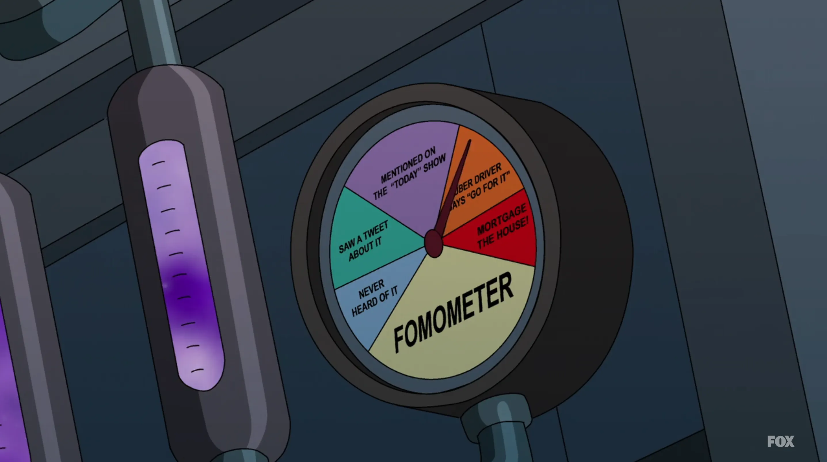 A meter shows the train chugging along at a healthy level of FOMO: “Uber driver says ‘go for it.’”