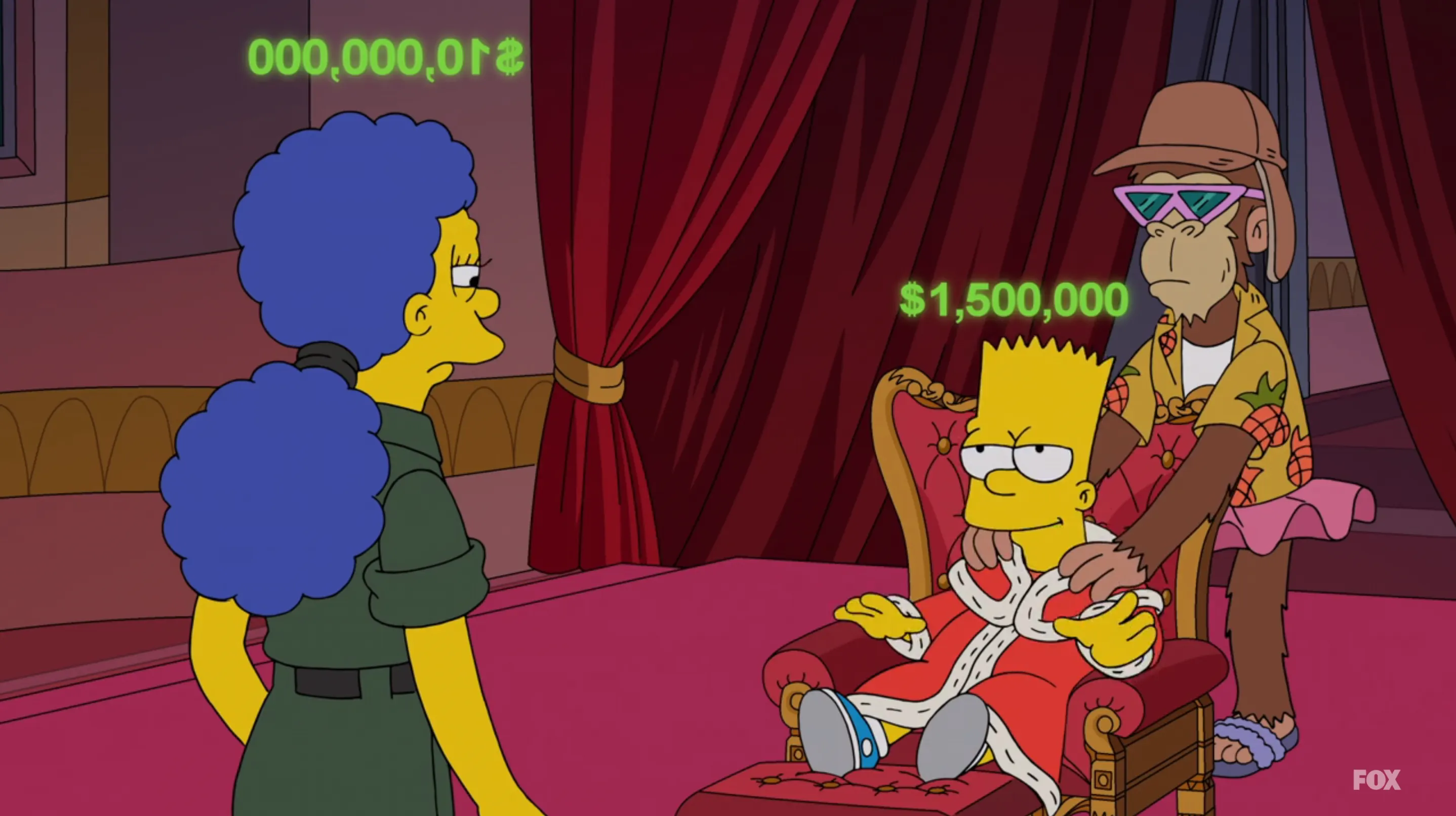 There she also finds Bart, who is receiving a massage from a “Jaded Ape”—an unmistakable reference to the Bored Ape Yacht Club, which apparently still counts among the top remaining NFT collections of value, in the opinion of "The Simpsons'” writing team.