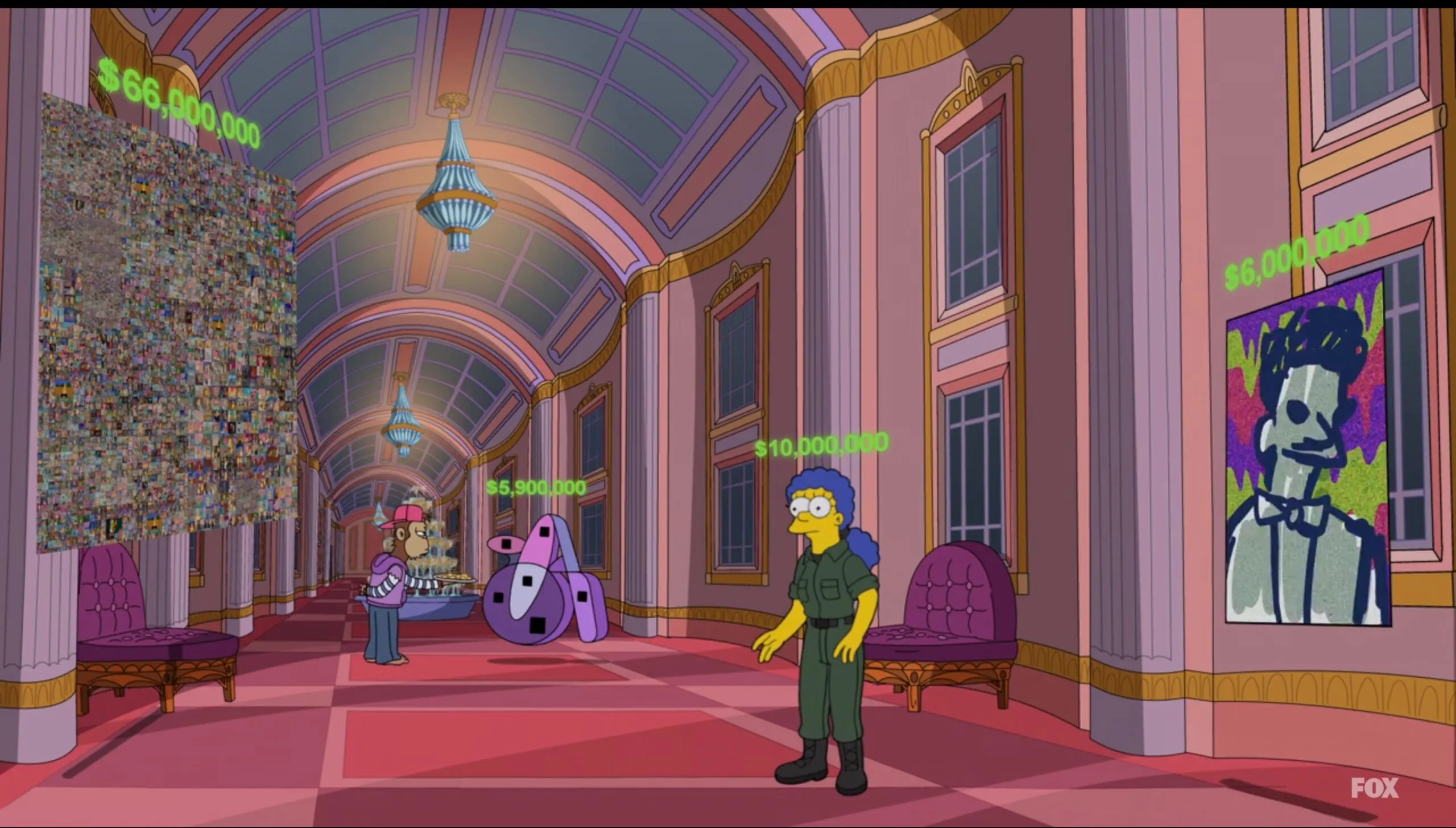 When Marge finally gets to the front of the NFT train, she finds herself in an elegant hall populated by digital artworks worth millions of dollars. The pieces she encounters are clear stand-ins for real on-chain art pieces, including “Everydays: The First 500 Days” and “Human One” by Beeple, “A Coin For the Ferryman” by XCOPY, and Dmitri Cherniak’s generative “Ringers” series.