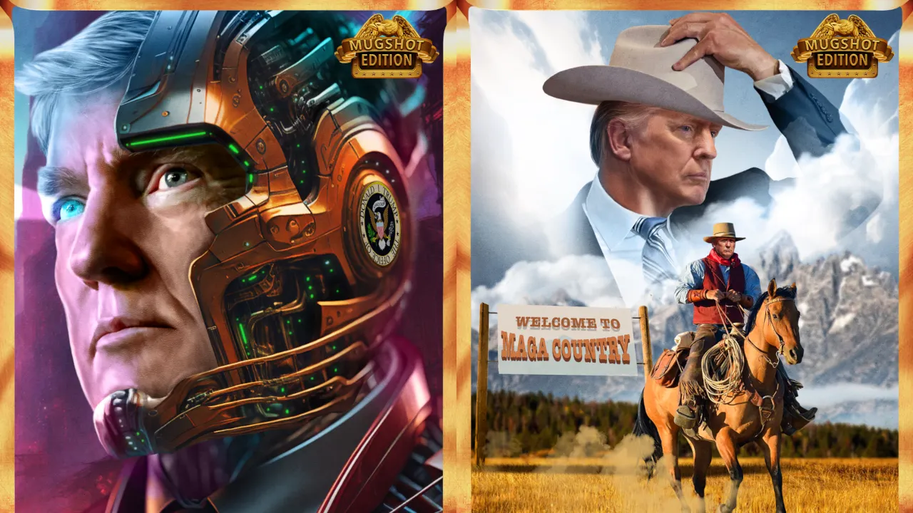 The collection’s framing refers to Trump being indicted on charges by the State of Georgia in August, and having his mugshot taken in Atlanta. He’s since used the photo to sell merchandise and raise funding for his presidential campaign, and now it’s part of the look and branding of his latest NFTs. But that’s not all.