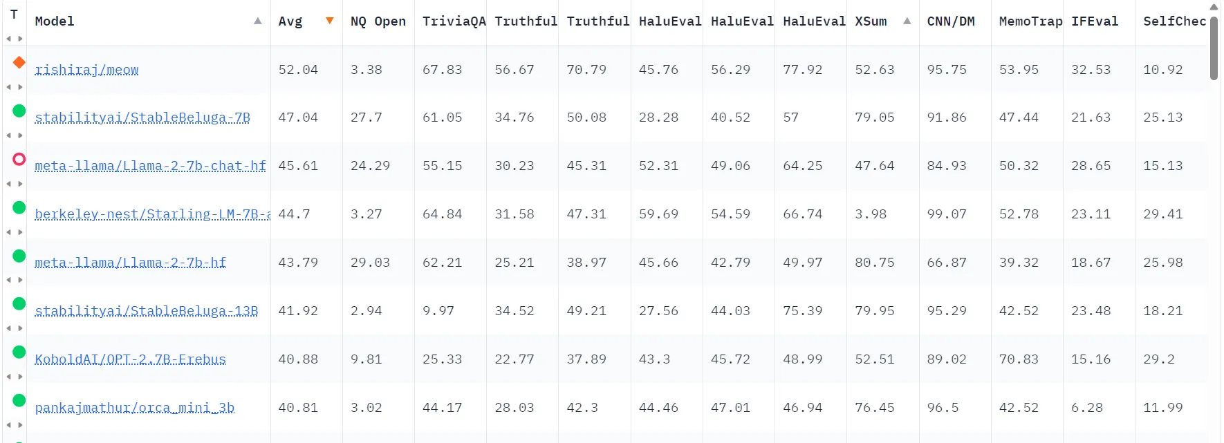 Based on the preliminary results from the Hallucinations Leaderboard, the models that exhibit fewer hallucinations—and hence rank among the best—include Meow (Based on Solar), Stability AI’s Stable Beluga, and Meta’s LlaMA-2. However some models that part from a common base (like those based in Mistral LLMs) tend to outperform its competitors on specific tests —which must be taken into consideration based on the nature of the tast that each user may have in mind.