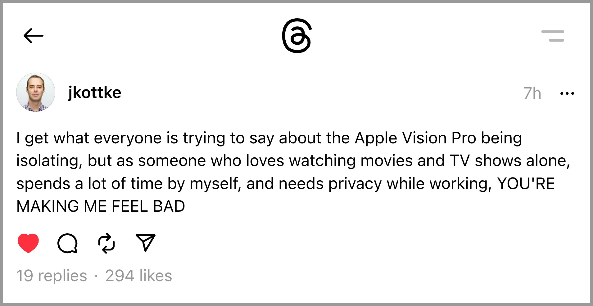 A lot of people are pointing out that the Apple Vision Pro is very personal, very private, and thus, very isolating. Apart from taking FaceTime or Zoom calls inside the device, it's not like you can be in a virtual space with friends. It's the best big-screen home theater screen you'll have, but you have to watch it alone.