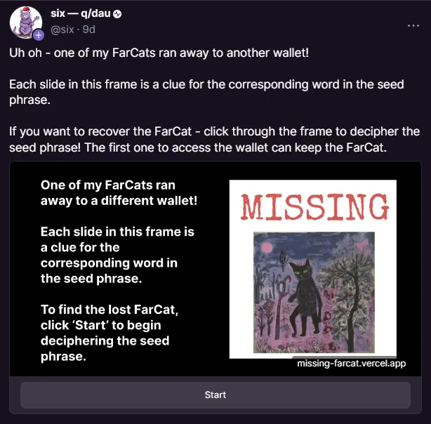 The same user who told us what our Spirit Pokemon would be also used Frames to create an onFrame scavenger hunt. Six, the creator, put a FarCat NFT into a wallet, and hid clues about what that wallet's seed phrase was in a Frame. Scavenger hunters flipped through pages of the Frame, and each page had a clue for one word in the seed phrase.