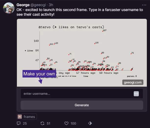 The final Frame on our list is something I’ve decided to call “Statcaster”, if the creator would like to use the name, I will be expecting a tithe. The Frame, by Farcaster user George, lets anyone input their username and check the stats on their casts. The chart shows your frequency of casts and how much engagement they get.
