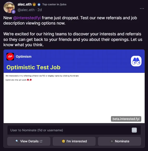 The InterestedFYI Frame is a way to share job opportunities. InterestedFYI sources jobs from crypto companies, and posts them in a Frame. Would-be applicants can read the job description in the Frame, indicate their interest in the job, or nominate another user for it. If Person A nominates Person B for a job, and Person B gets the position—then Person A would receive a referral fee. Now that’s a win-win.