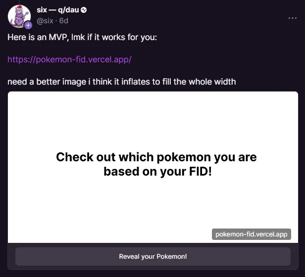Before going any further into the unexplored terrain that is Frames, it’s important to know what spiritual forces are guiding you. So make sure to stop by this Frame to figure out which Pokémon you would be, based on your FID. FID stands for “Farcaster ID”—it’s a number that denotes when you joined and serves as a unique identifier for your account.