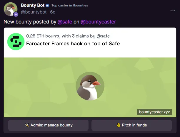 This Frame takes a common occurrence in crypto—issuing and taking bounties for different tasks—and lets people manage them all within Farcaster. With the BountyBot Frame, users issue bounties to the Farcaster community, take on a bounty themselves, or even add funds to bounties that they think are important.