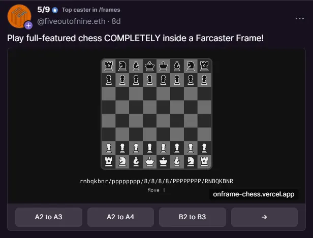 Farcaster user fiveoutofnines utilized Frames to create an “onFrame” Chess game. Anyone can play at any time, for free. You can even choose which difficulty you want your opponent to play at. The Frame sets you up against an AI opponent, and you control your chess pieces by pressing buttons at the bottom of the Frame.
