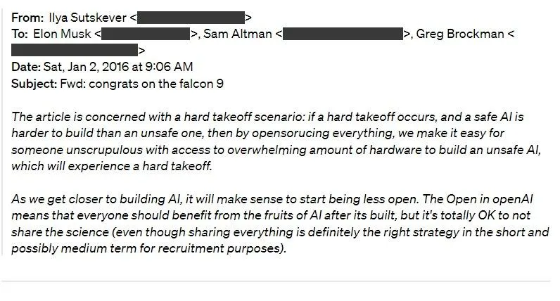 OpenAI also shared an email allegedly sent by co-founder Ilya Sutskever that questioned the wisdom of building out in the open, saying bad actors could manipulate the technology and that holding back its research may be wise to prevent misuse.