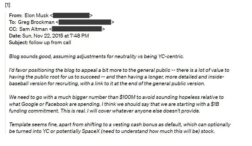 “We need to go with a much bigger number than $100M to avoid sounding hopeless relative to what Google or Facebook are spending,” Musk allegedly wrote in one message. “I think we should say that we are starting with a $1B funding commitment. This is real. I will cover whatever anyone else doesn't provide.”