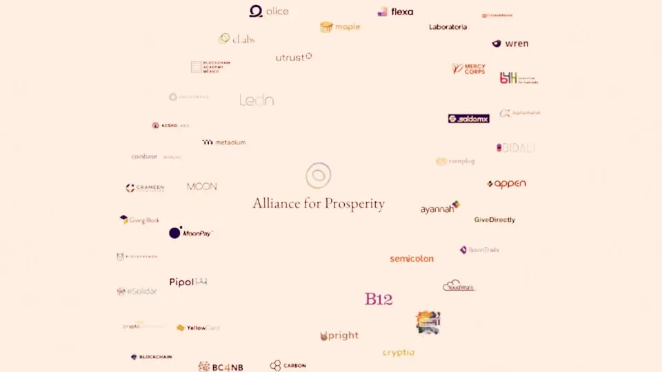 The Alliance for Prosperity includes a mix of blockchain-leaning tech companies like Carbon, mobile wallet providers like Blockchain.com, crypto payment processors such as Coinplug, and investment firms like Polychain.