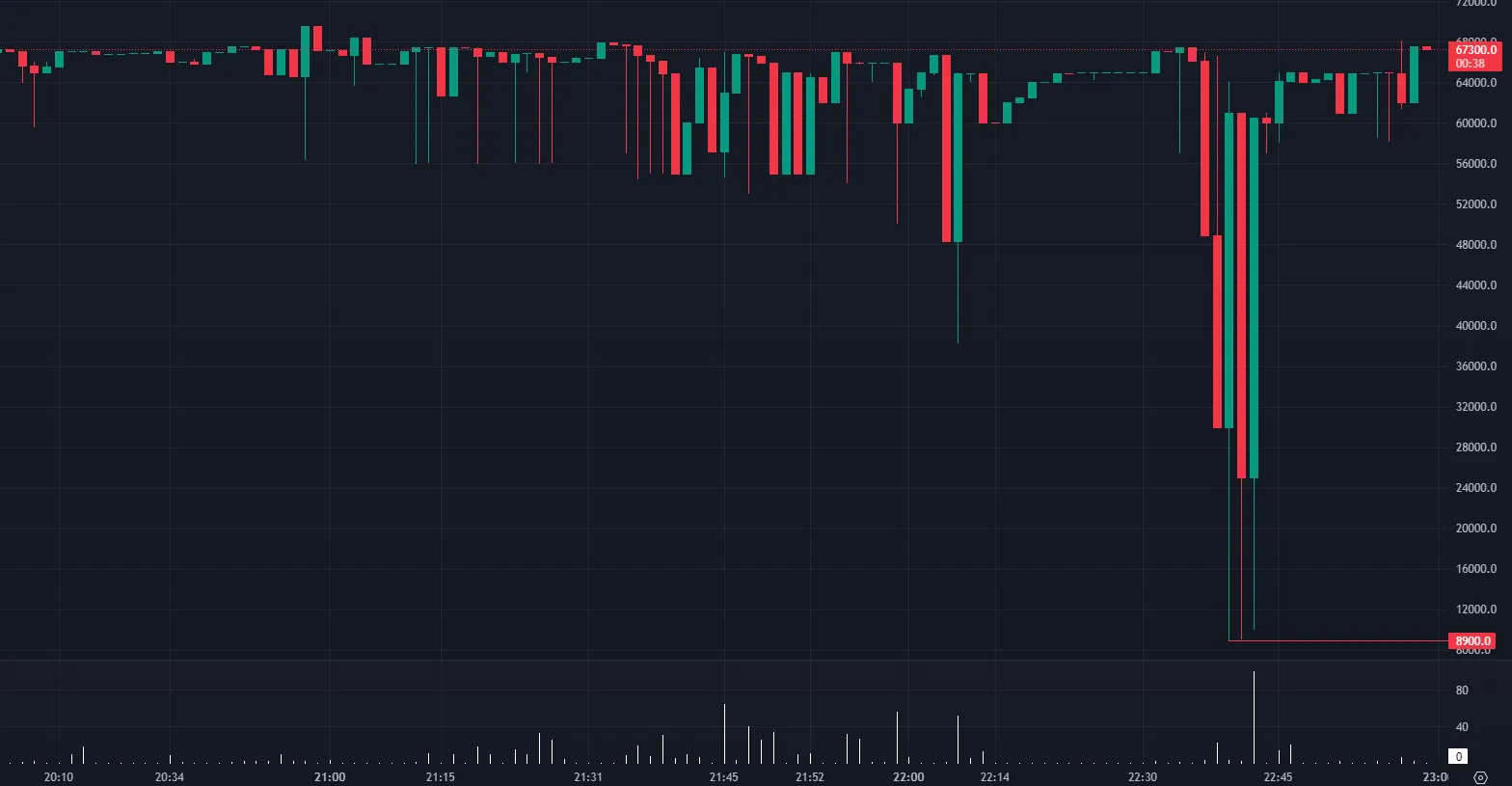 The rapid descent began at 22:40 UTC, and within just two minutes, prices had fallen to their lowest level since early 2020. This abrupt drop was followed by an equally swift recovery, with prices rebounding to $67,000 within 10 minutes of the drop.