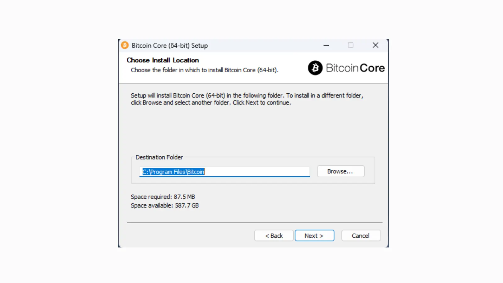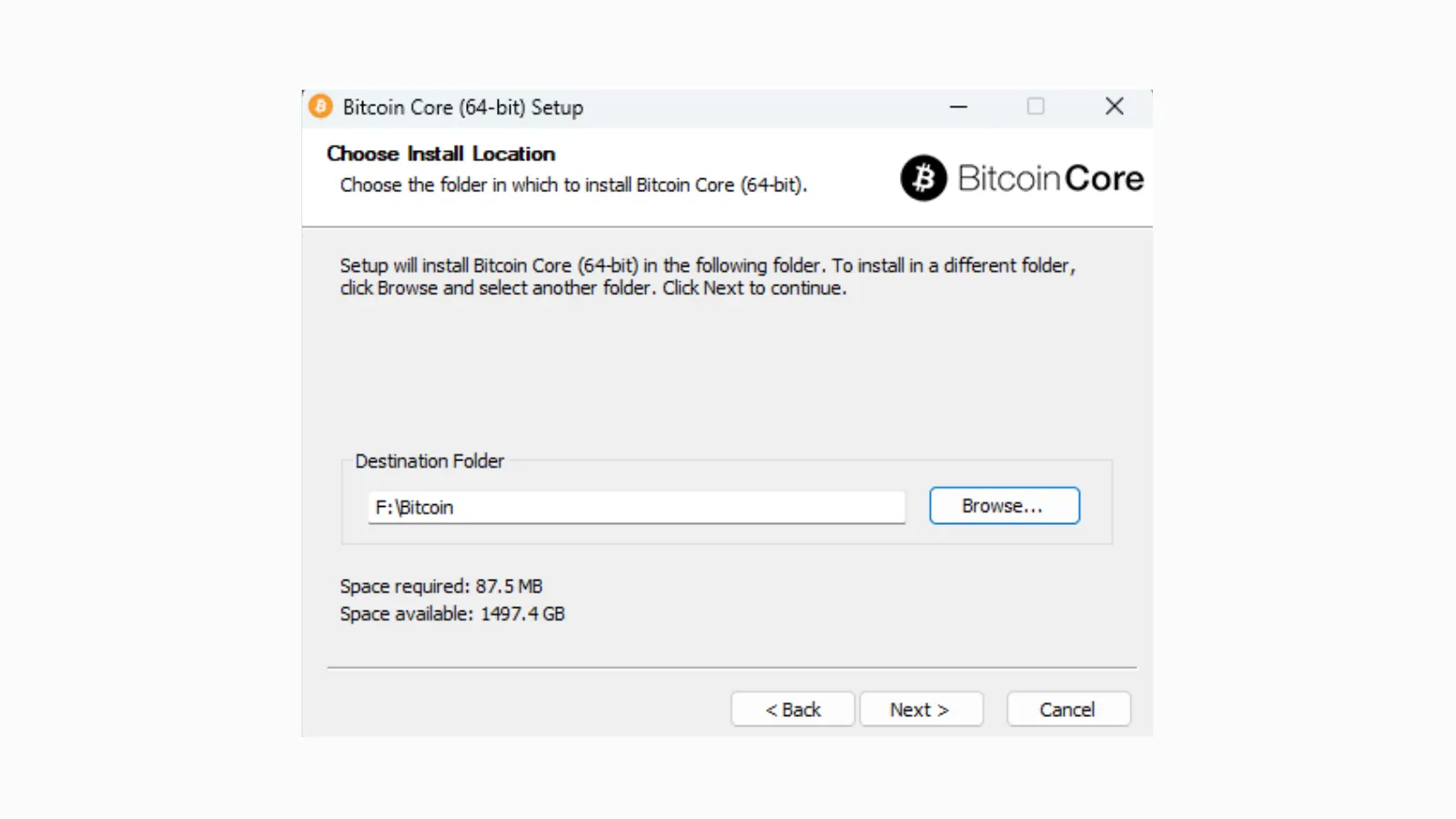 Choose the destination for the Bitcoin file. Important note: be sure to point the installer to the drive you intend to store the Bitcoin installation files and data for the node.