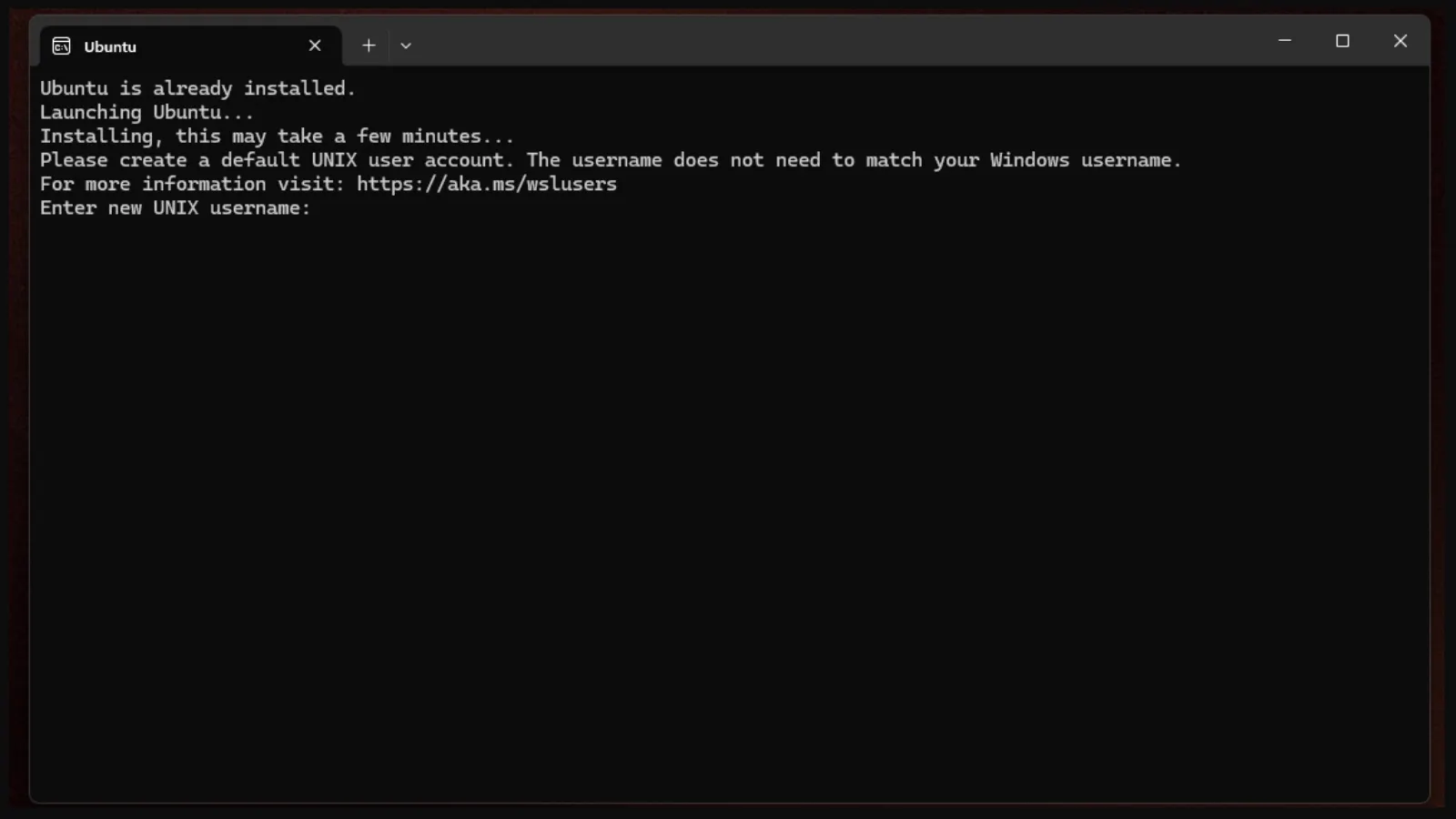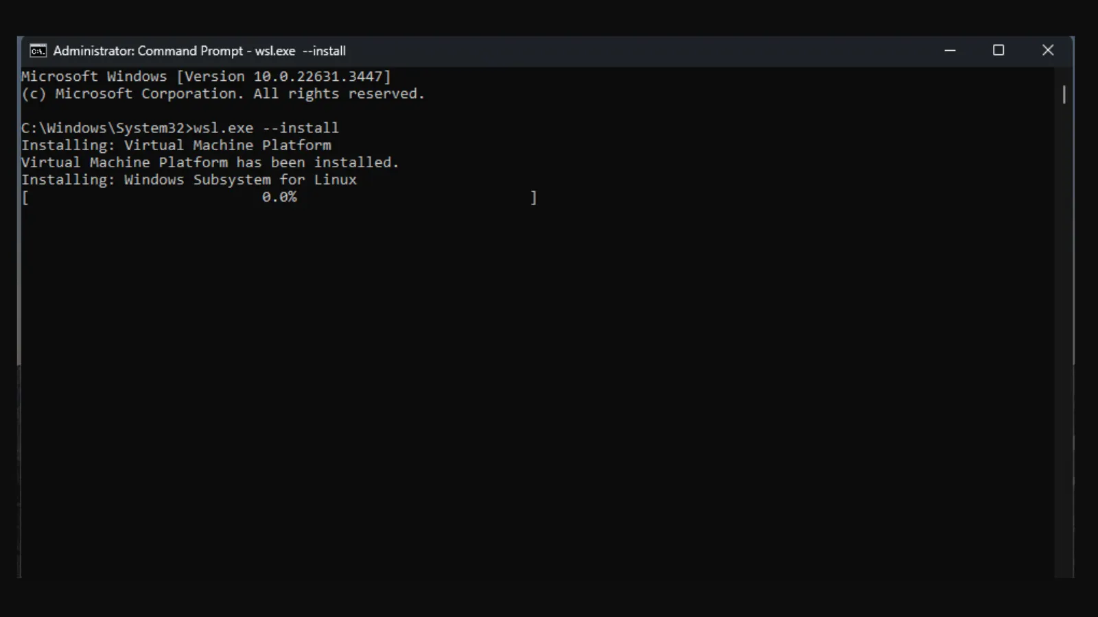 In the command line, type “wsl.exe –install” and press enter, which will begin installing a virtual machine platform, Windows Subsystem for Linux, and Ubuntu onto the PC.