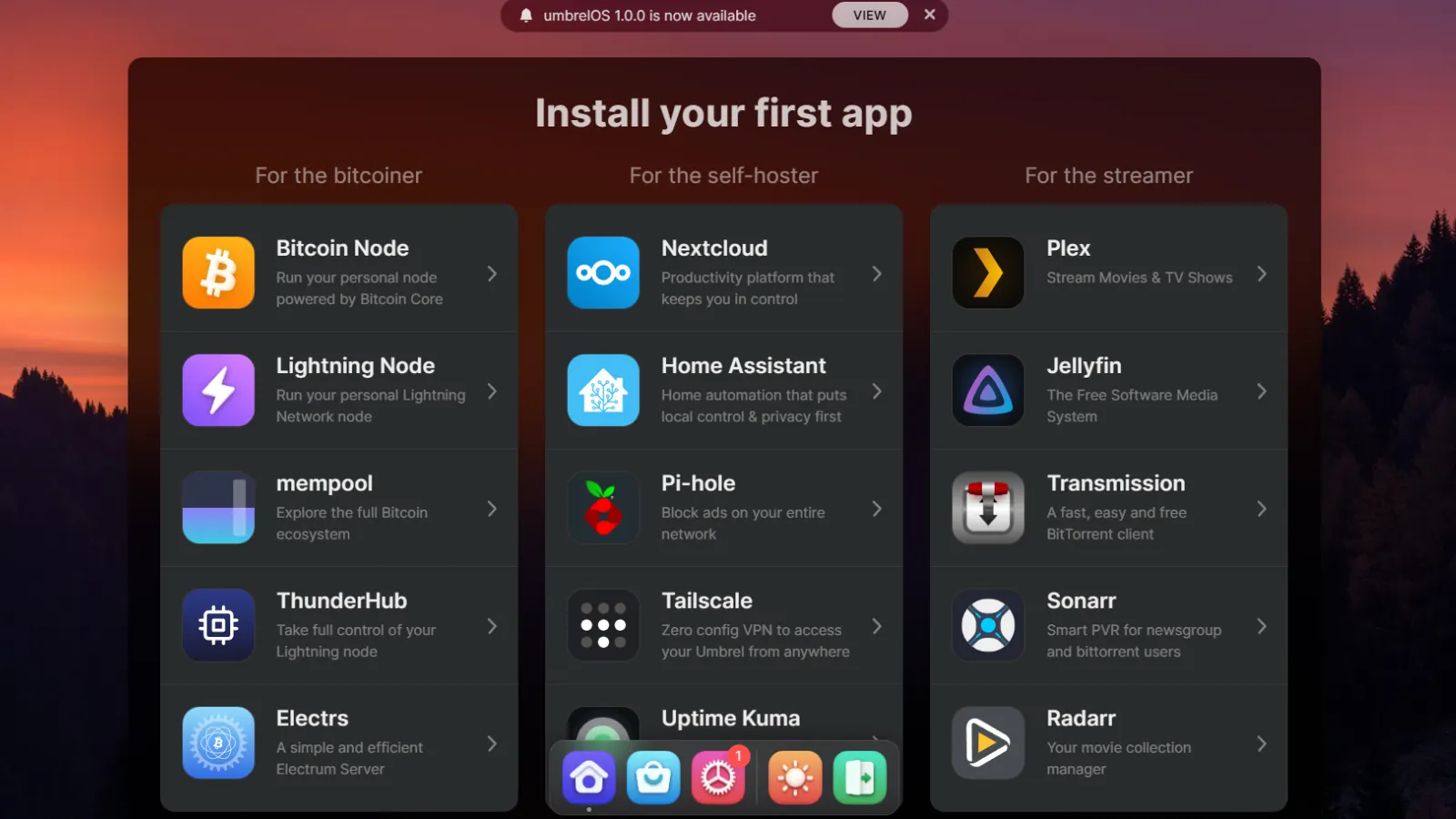Go to the Umbrel URL provided, and you should see the UmbrelOS desktop screen.
