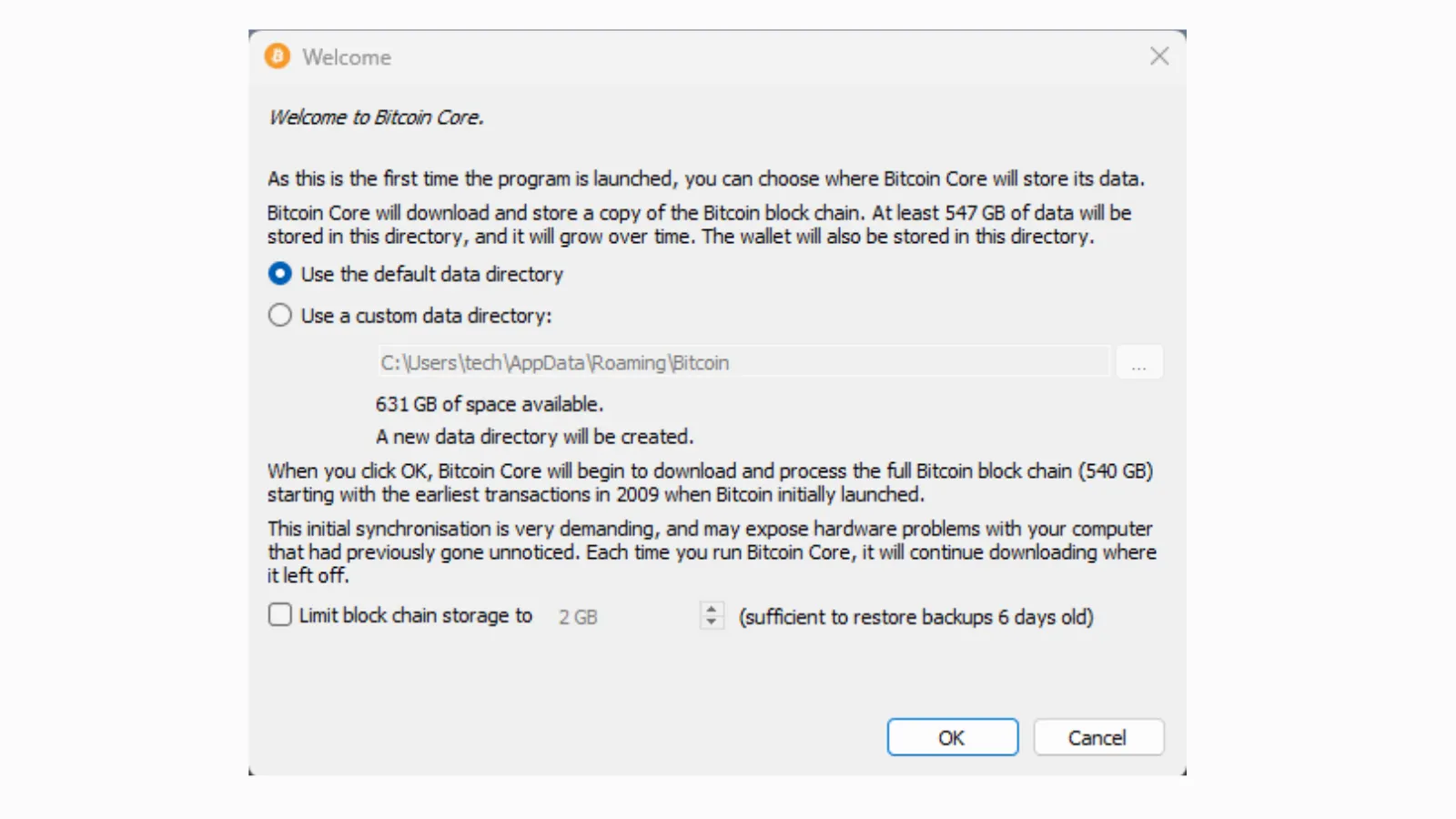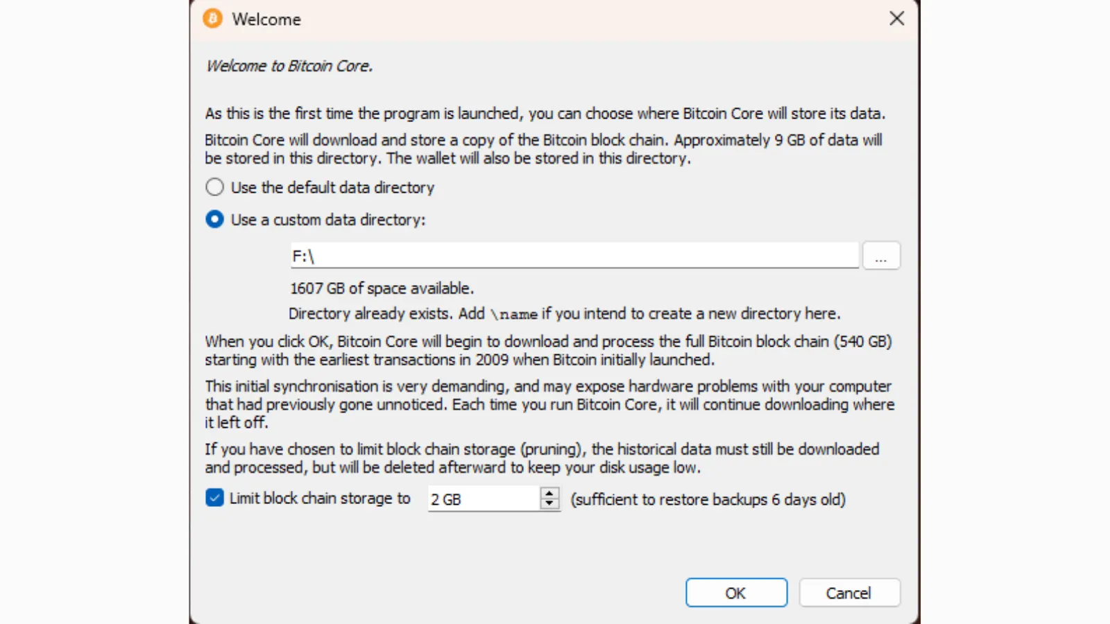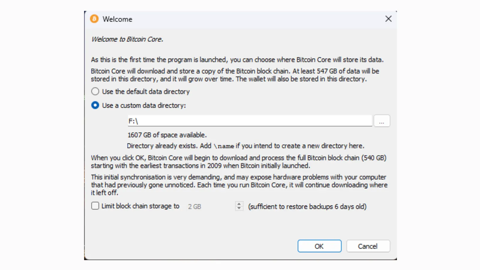 If you do intend to prune the amount of Bitcoin blockchain data stored on your hard drive, select “Limit blockchain storage to” and choose how much space to allocate. Click OK.
