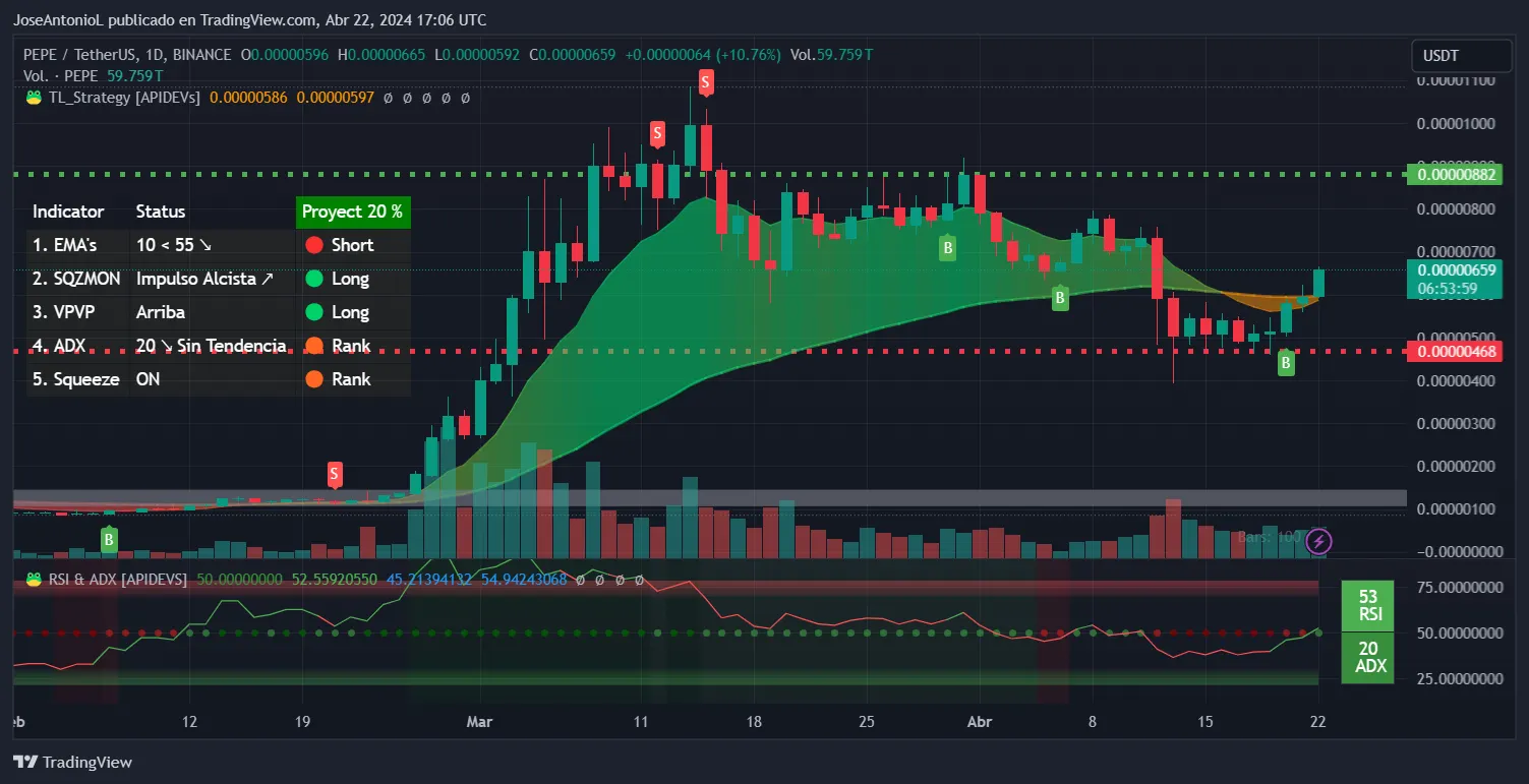 In the last 24 hours, the price of PEPE went from $0.00000572 to its current price of $0.00000666 for a 16% spike, and a sizable 30% jump in the last seven days. Although it's down nearly 13% in the last 30 days after suffering a major correction, the token's technical indicators suggest that it's recovering and could be bouncing back to a bullish trend.