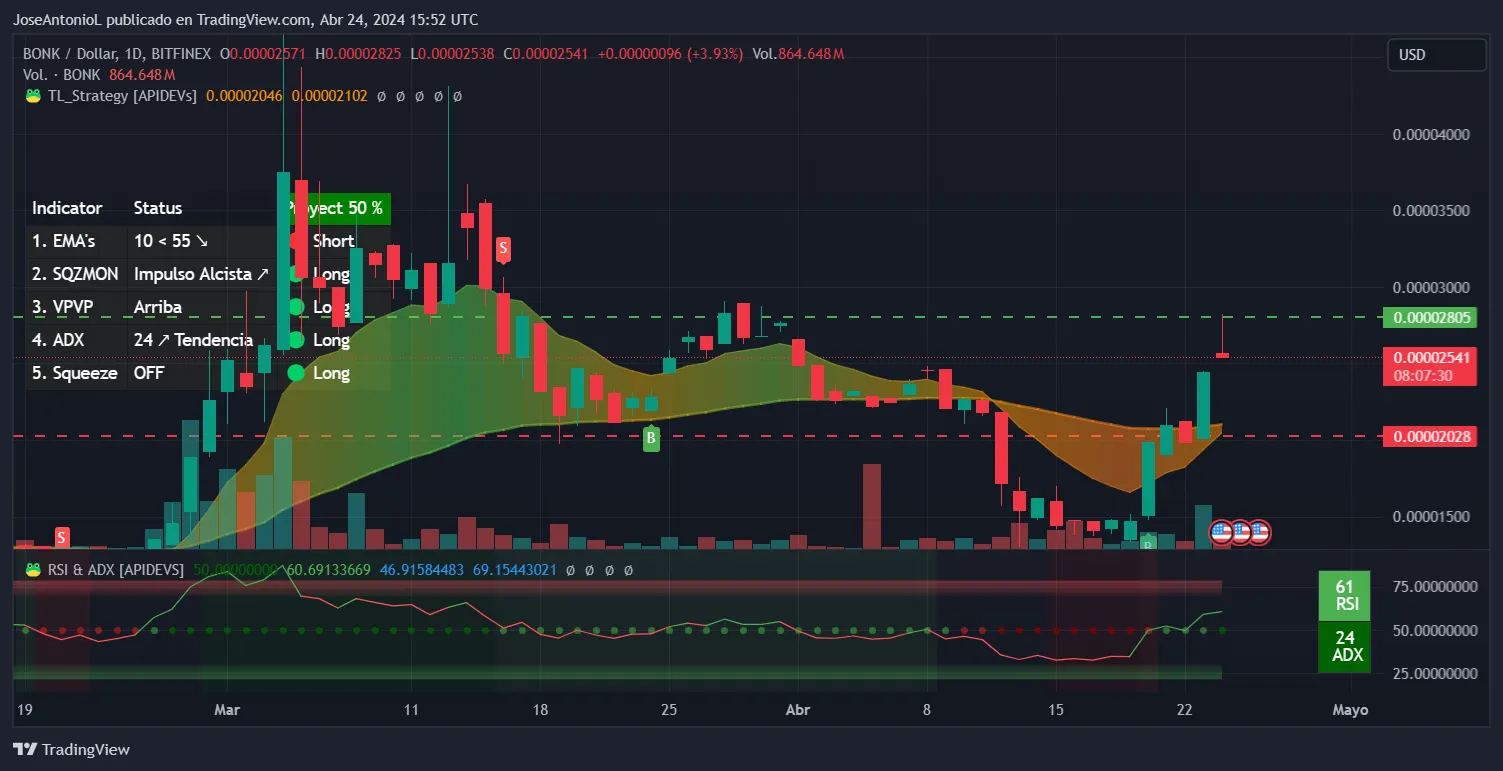 From a Technical Analysis perspective, BONK is looking bullish but not strong enough to recommend a trade with a big margin of rewards. The coin is going through a price recovery phase, with the exponential moving average across 10 days (EMA10) and 55 days (EMA55) nearing a golden cross, confirming a bullish sentiment overall.