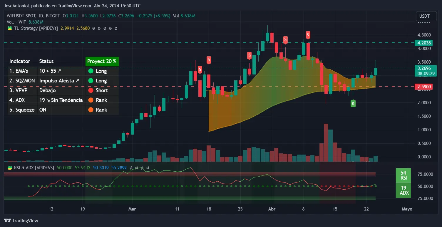Dogwifhat looks bullish overall, despite its 50% correction in early April. The gap between the EMA10 and the EMA55 is increasing, meaning that prices are accelerating as time passes. The Squeeze Momentum Indicator shows a trend reversal in play, with traders rebuying the token after the price correction.